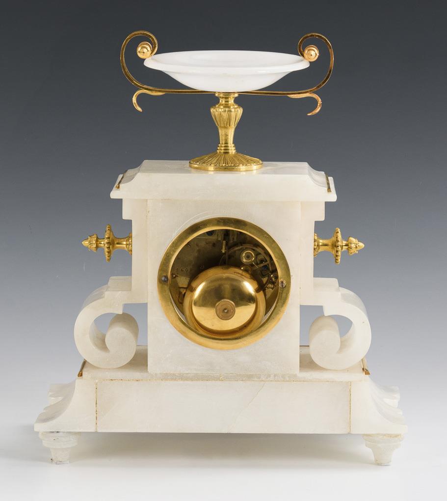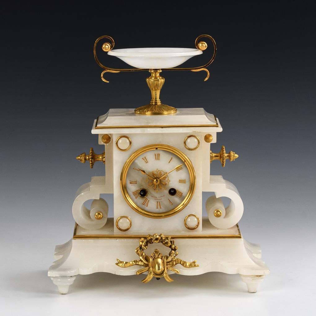 White alabaster clock with shell crowning. Japy Frères & Cie.