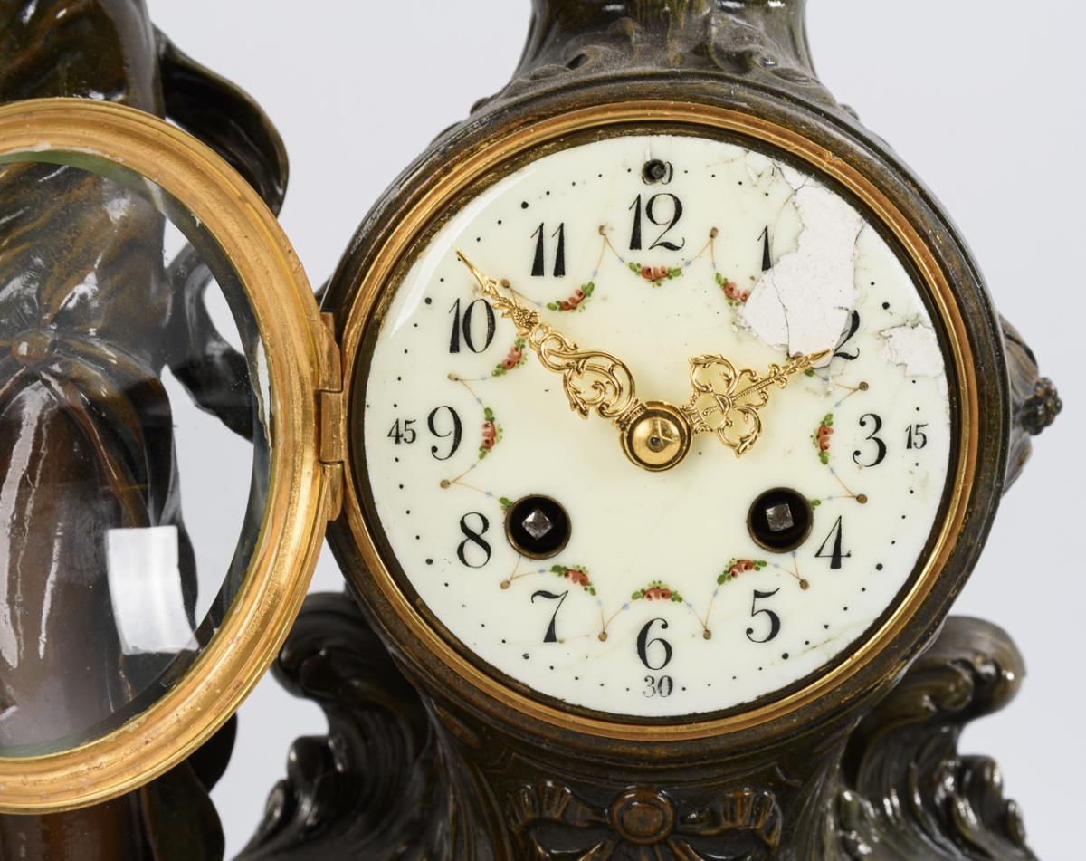 White marble with black veining, bronzed metal casting, bronze/brass repainted. Clock approx 47.5 x 34 x 14.5 cm, side plate H 39 cm. Total 13,3 kg.