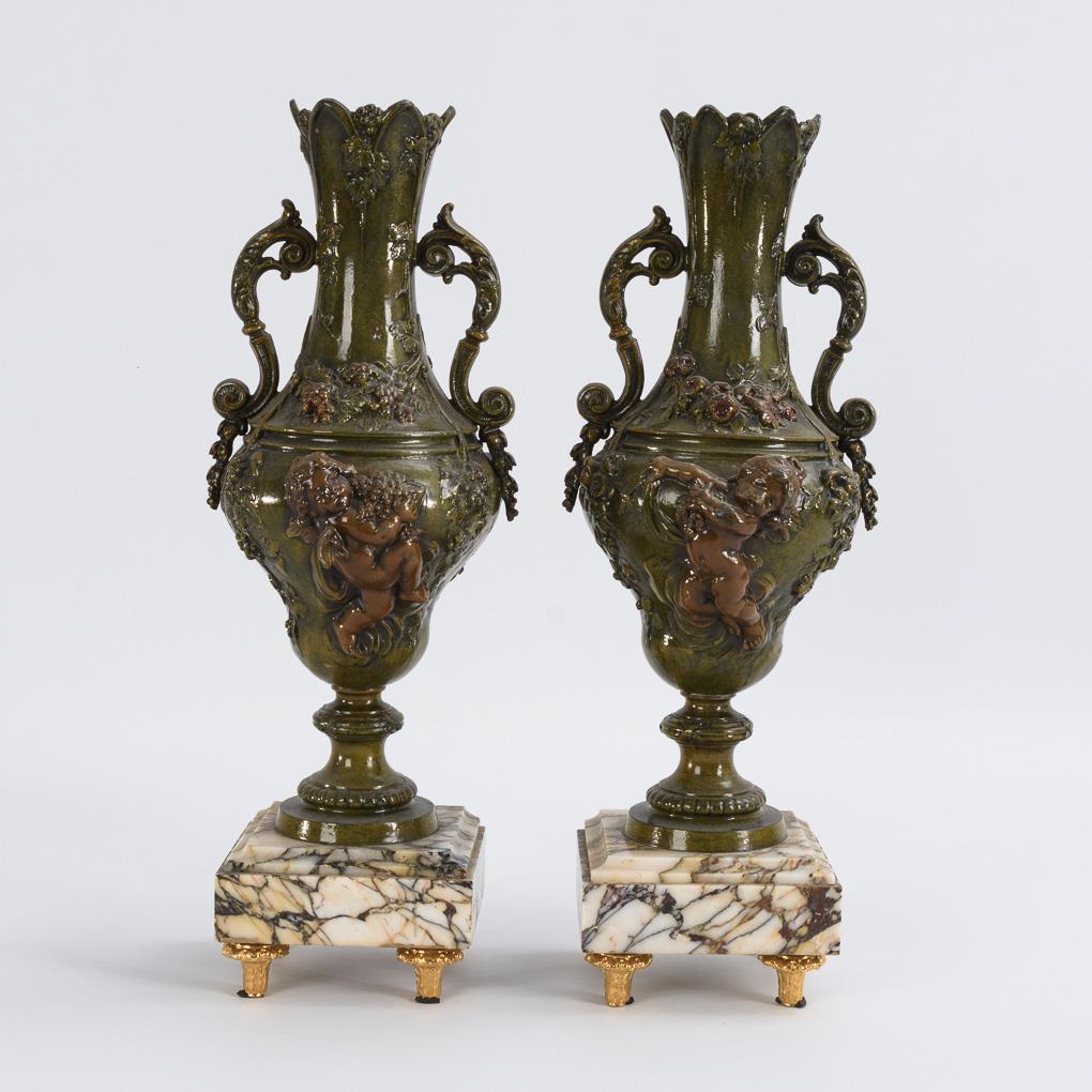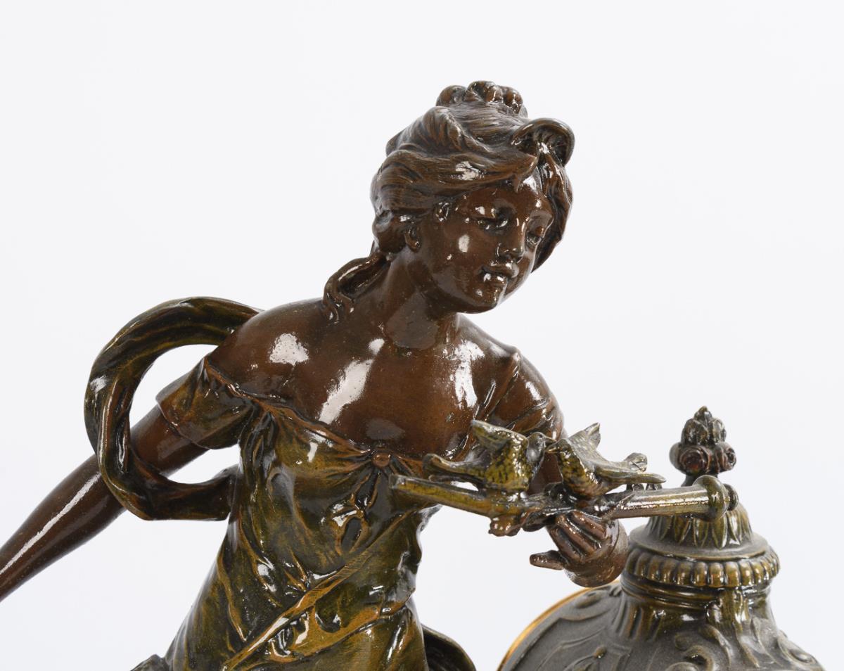 Rectangular base with crowning bird catcher holding a flute with doves (The Enchantress). Made according to the model of the French sculptor Hippolyte Francois Moreau (1832-1927). Comes with 2 matching vase side plates with floral relief decoration. Use old and new parts, minimal signs of use.