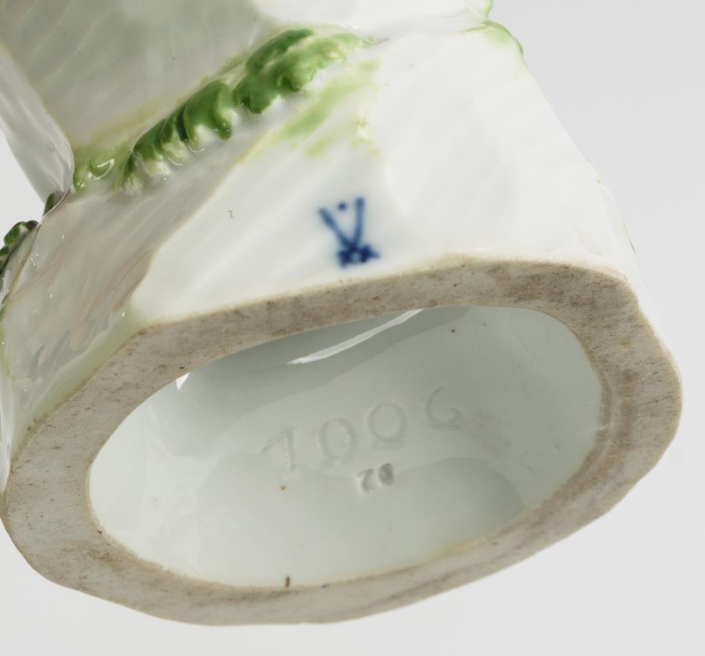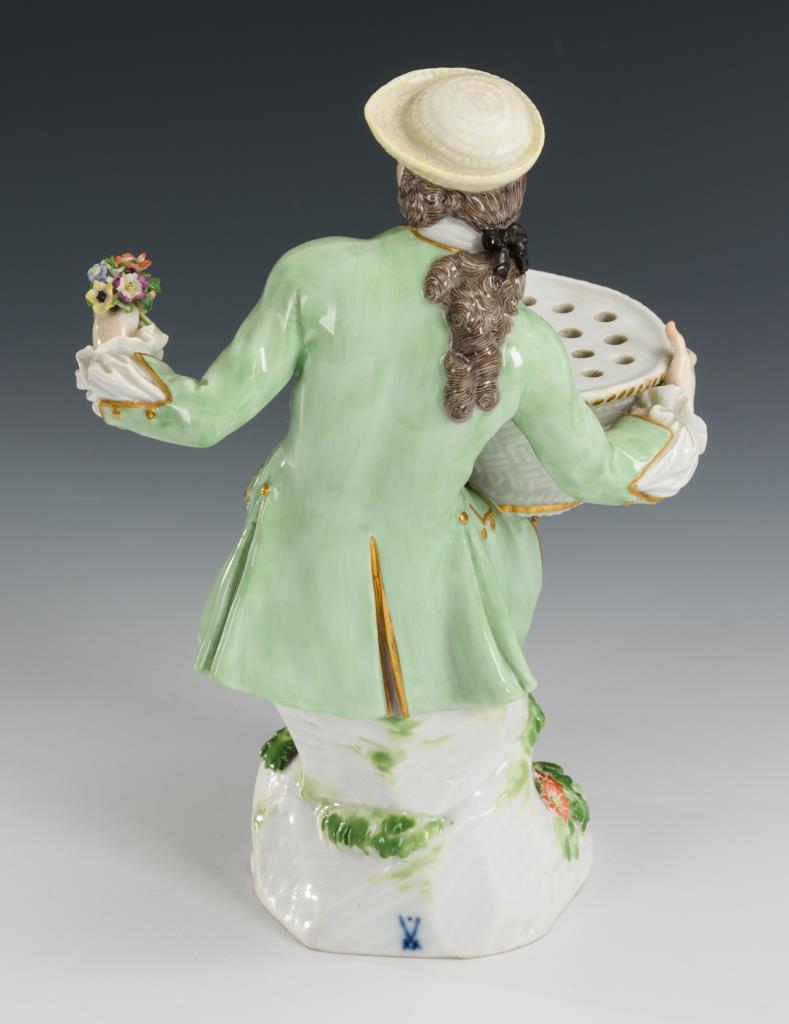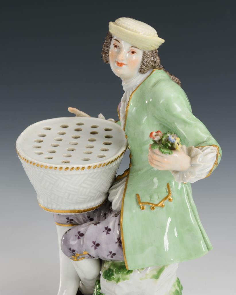 Auf einem Felssockel sitzender Gärtner, einen Korb mit durchbrochenem Deckel tragend. Schuhe restauriert, Blumensträußchen etwas bestoßen.