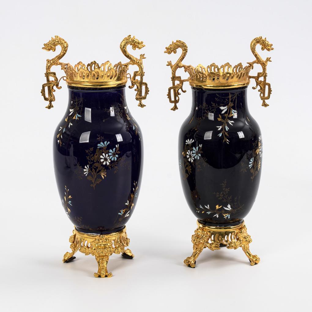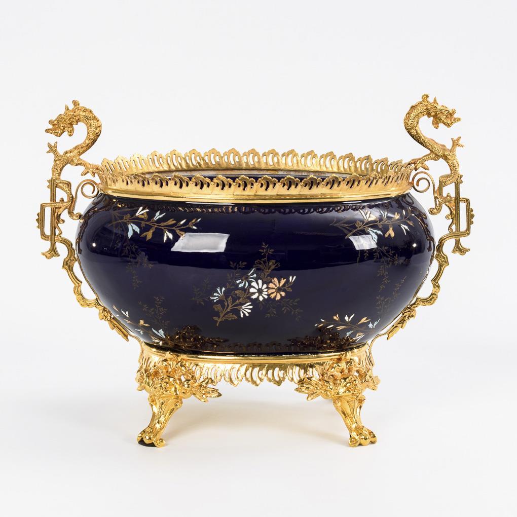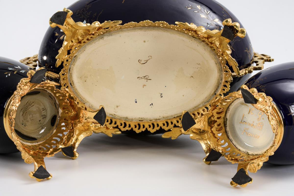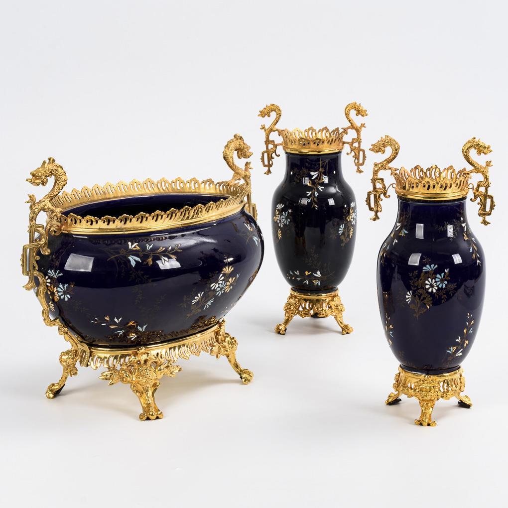 Founder period jardinière and 2 side vases with bronze mounts. Keller & Guérin, Lunéville.