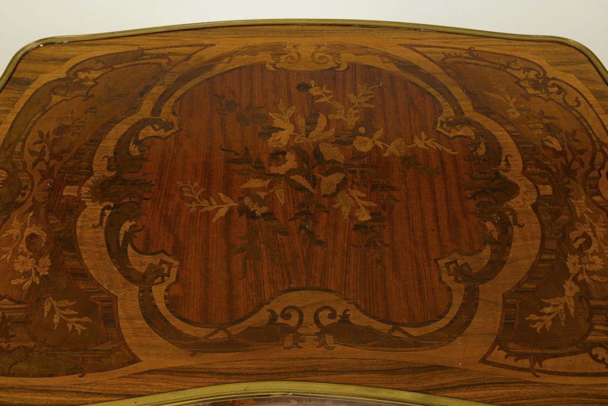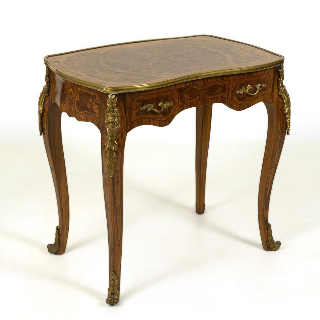 Decorative salon table in style-typical curved design, frame drawer with curved frame, decorated with lush acanthus leaf bronze fittings, brass trim and floral marquetry; drawer not lockable. Traces of age / use, drawer somewhat warped.