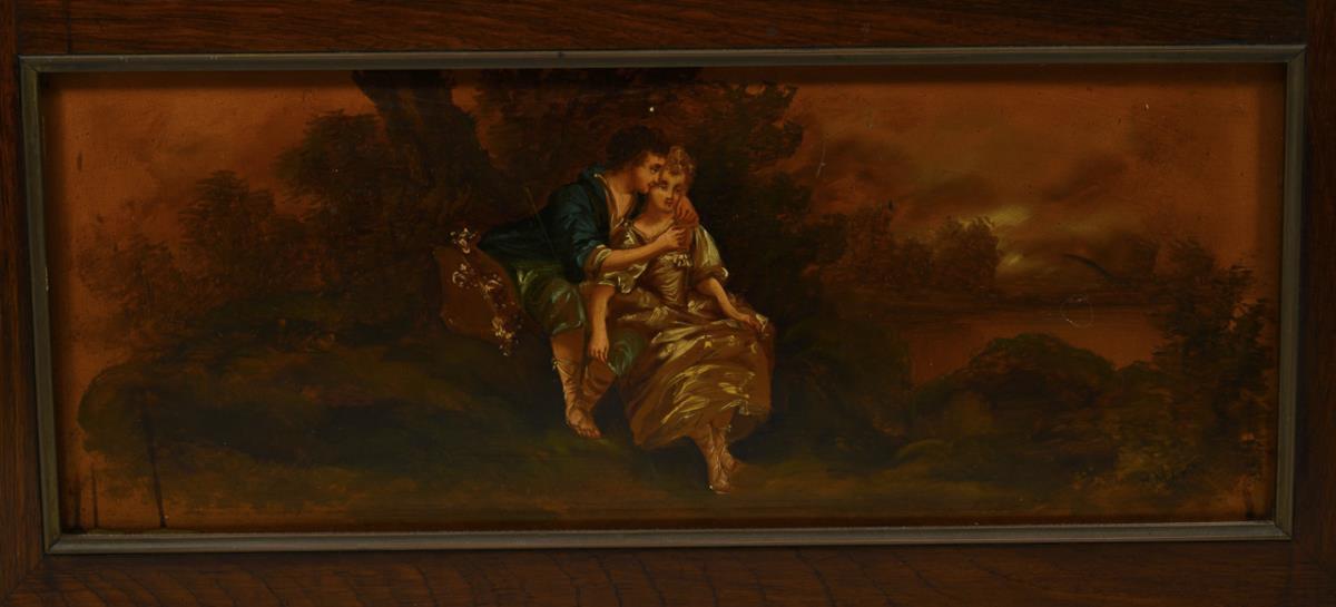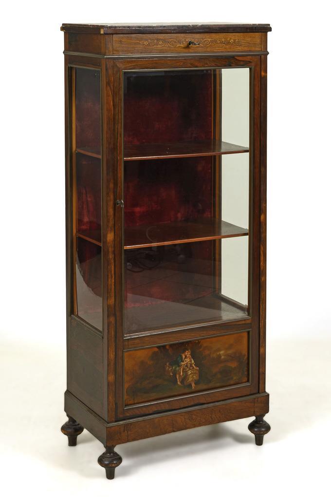 Elegant 1-door, 3-sided faceted-glazed pillar display case with head drawer, on 4 turned feet; 3 visible shelves, lower shelf hidden; Head drawer decorated with tendril work inlay, lower cassette with painted lovers in a landscape in Watteau style, accented with brass struts, top plate of reddish-gray marble; inside 3 shelves, back wall lined with burgundy velvet. Traces of age / use, quite a few trims loose, veneer with defects, top plate supplemented.