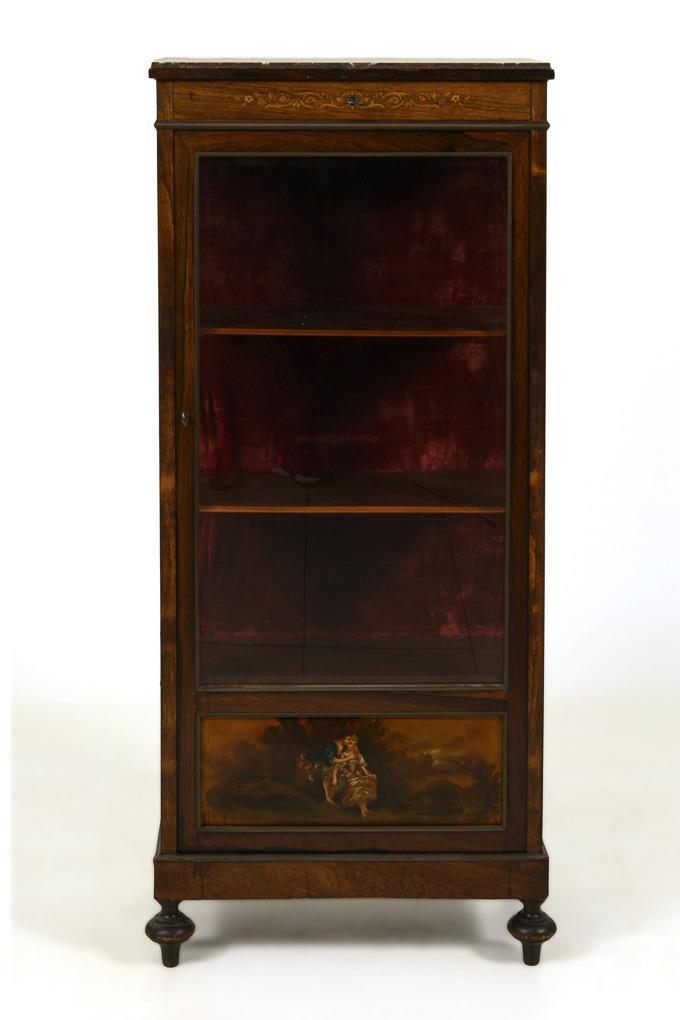 Elegant 1-door, 3-sided faceted-glazed pillar display case with head drawer, on 4 turned feet; 3 visible shelves, lower shelf hidden; Head drawer decorated with tendril work inlay, lower cassette with painted lovers in a landscape in Watteau style, accented with brass struts, top plate of reddish-gray marble; inside 3 shelves, back wall lined with burgundy velvet. Traces of age / use, quite a few trims loose, veneer with defects, top plate supplemented.