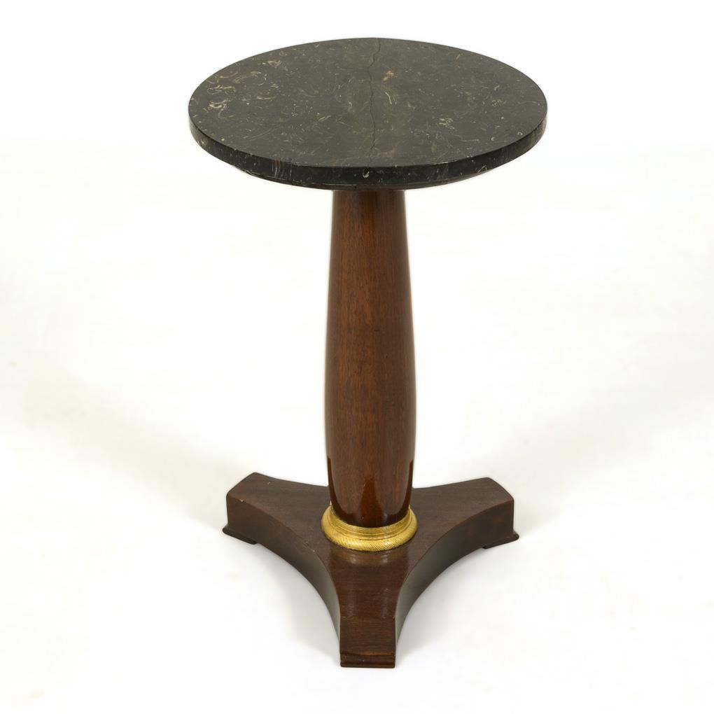 Walnut? mahogany stained, black, gray veined marble. H approx 57 cm, Ø plate approx 37 cm.