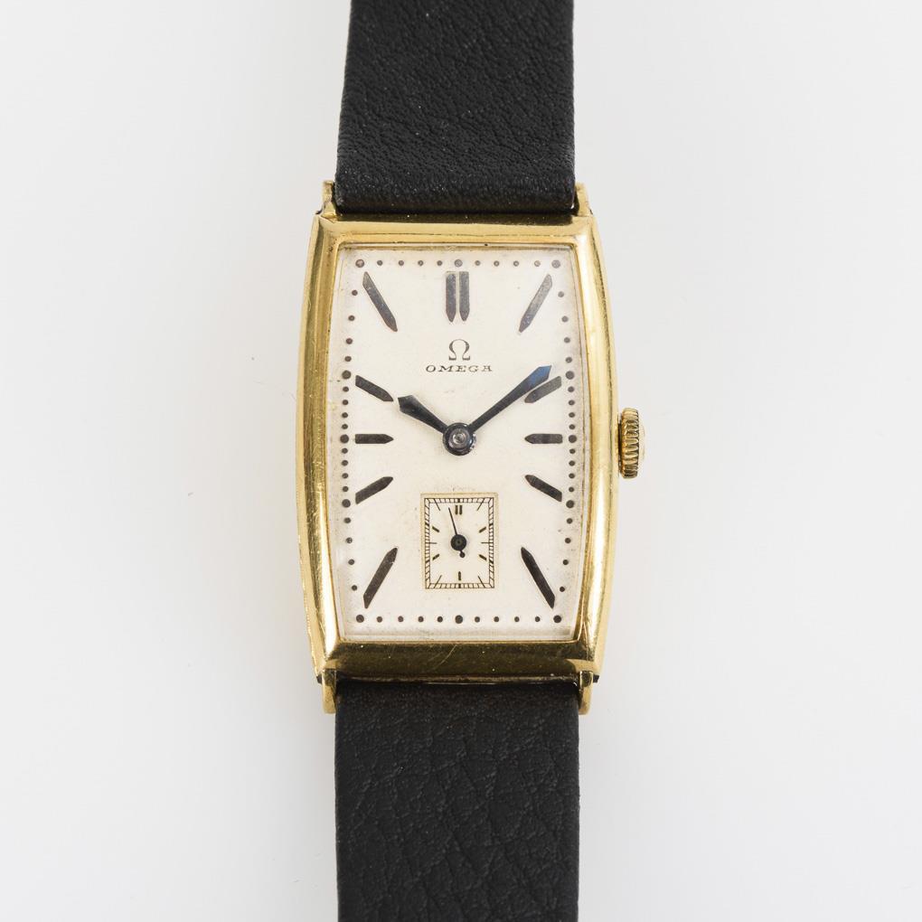 Rectangular case on supplemented black leather strap with gold-tone pin buckle.
