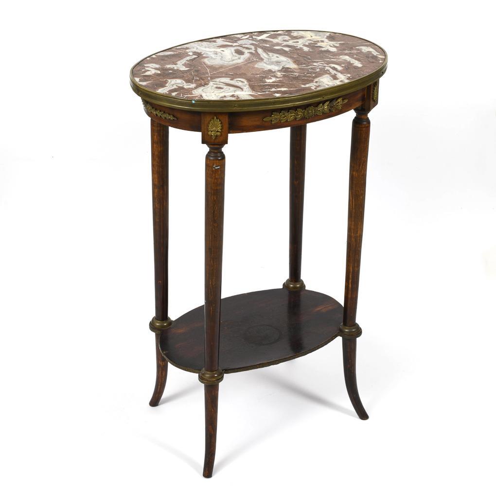 Elegant oval side table with smooth frame and 4 conical legs with plinth, table top in reddish-gray marble; discreetly decorated with vegetal bronze applications and surrounding brass band. Signs of age/use.