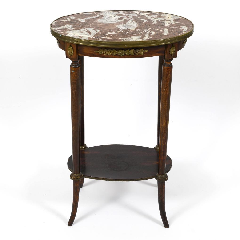 Elegant oval side table with smooth frame and 4 conical legs with plinth, table top in reddish-gray marble; discreetly decorated with vegetal bronze applications and surrounding brass band. Signs of age/use.