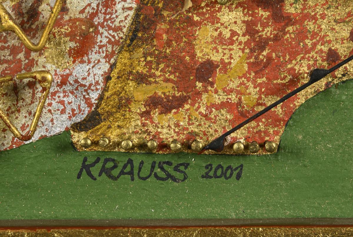 Mixed media/canvas/wood with figurative metal applications. Signed lower right, titled on verso. 2001.