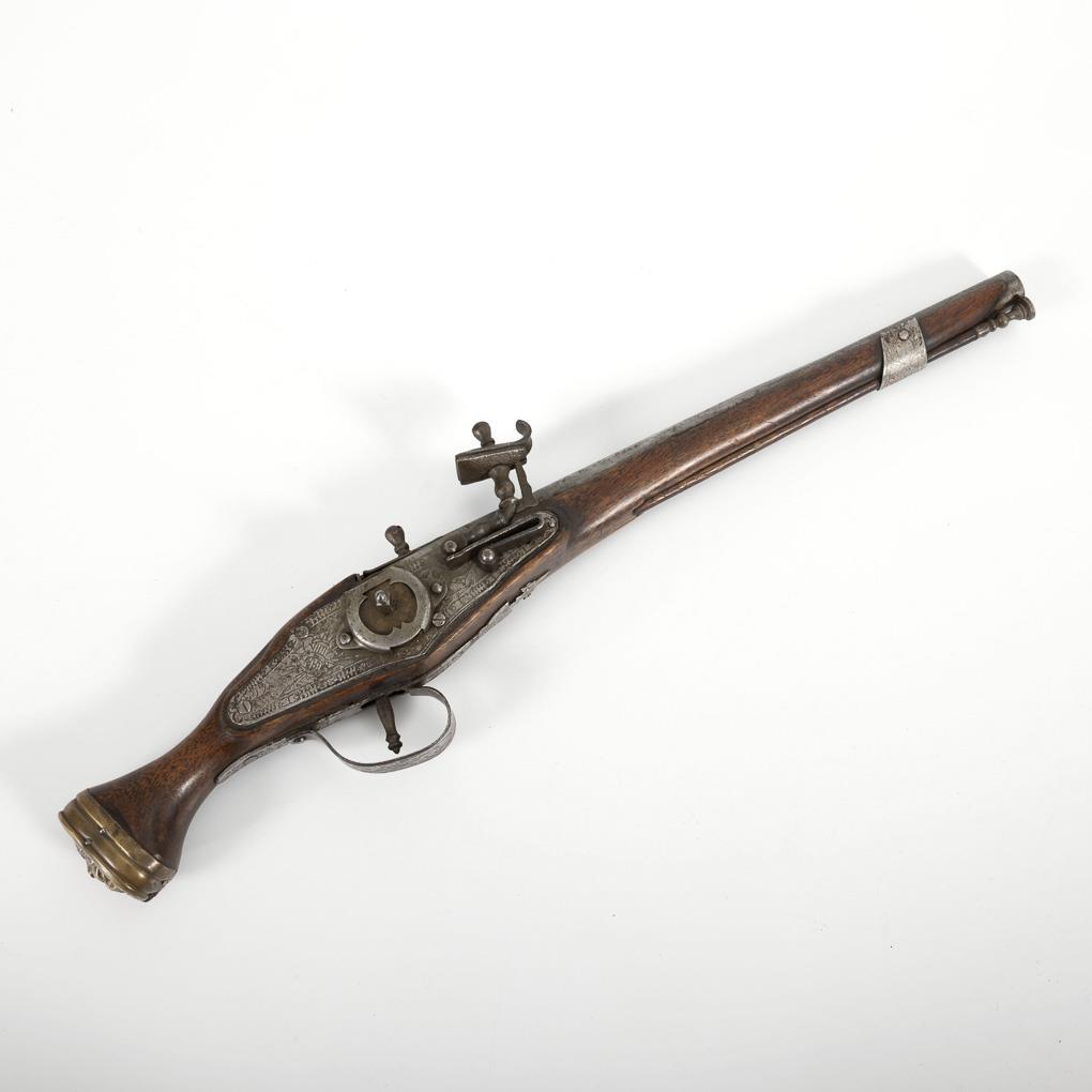 Decorations etched on lockplates and barrel, brass pommel with lion head, ramrod present.
