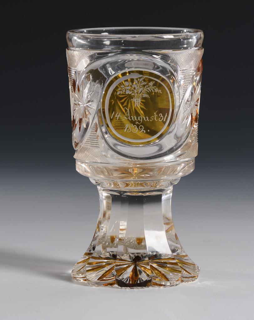 Cylindrical dome with notch and stone cut, faceted stem and multi-pass foot with bottom star. On the dome three high-cut medallions, 2x of which with an engraved view of Warmbrunn and Kynast and 1x with the date "August 14, 31 1832".