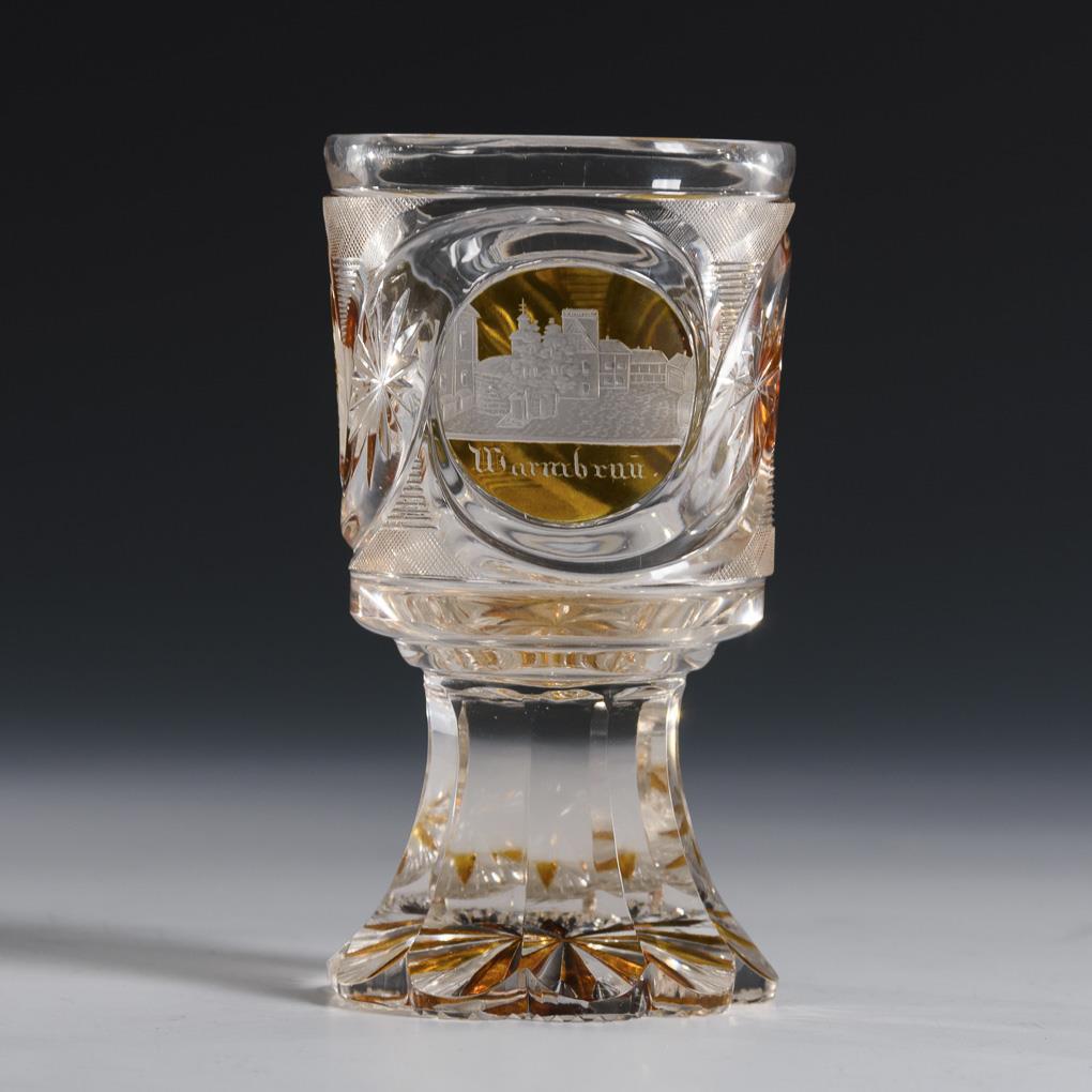 Cylindrical dome with notch and stone cut, faceted stem and multi-pass foot with bottom star. On the dome three high-cut medallions, 2x of which with an engraved view of Warmbrunn and Kynast and 1x with the date "August 14, 31 1832".