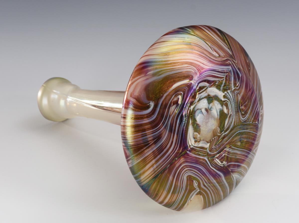 Colorless glass with opal white inner rim and fused on the body, pointed marbling in red and opal white, iridescent. H 18 cm.