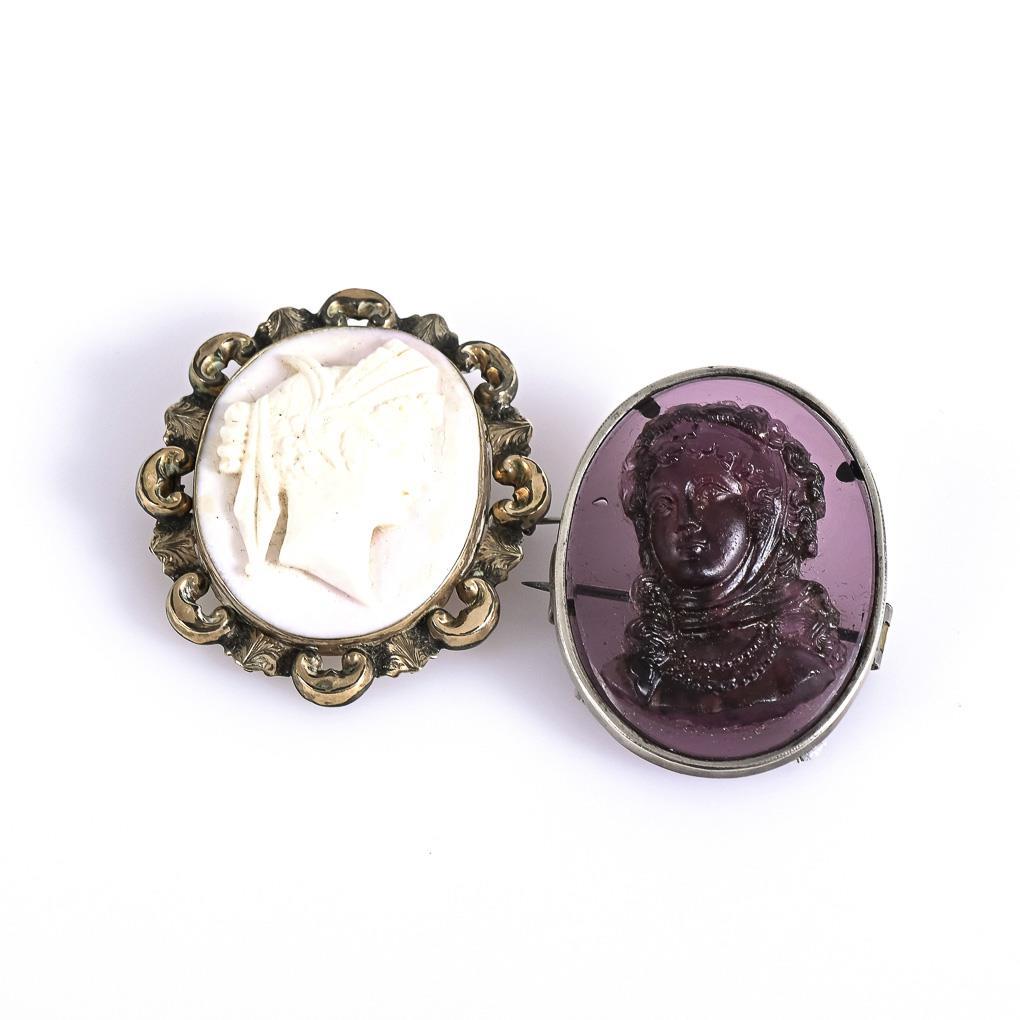 Glass relief with portrait of Queen Luise, in open frame setting. Coral cameo with antique cut female profile head in rim decorated frame. Hook clasps..