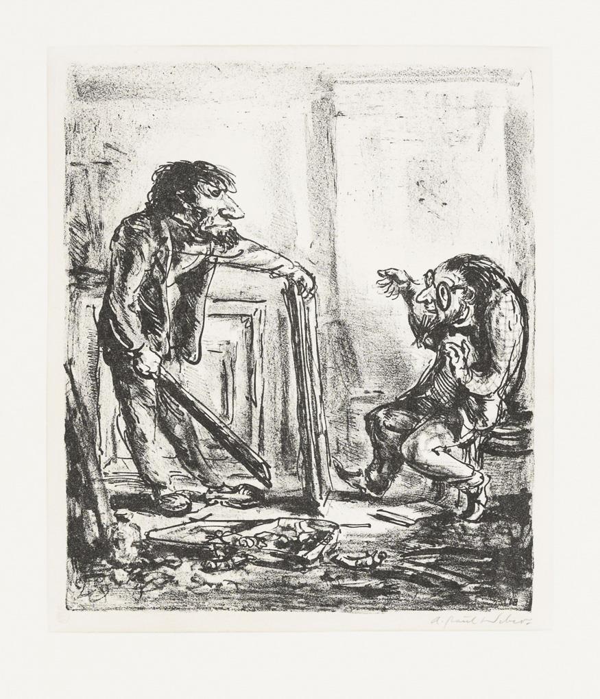 "Rocking Hedgehog Children", lithograph, signed in print, red stamp "Clan Press", verso purple stamp "Estate A Paul Weber" with pencil signature "Christian Weber", [1980], sheet: 65 x 50.8 cm, cf. Dorsch WVZ 276 | "Divided Opinion", lithograph, red stamp "Clan Press", pencil signature, [1978], sheet: 65.2 x 50 cm, cf. Dorsch WVZ 858.