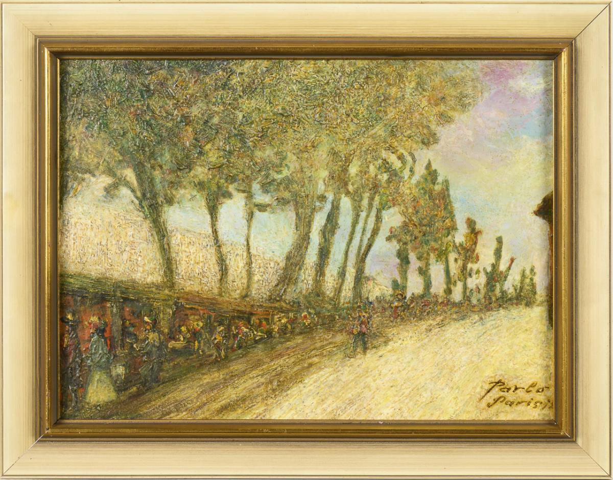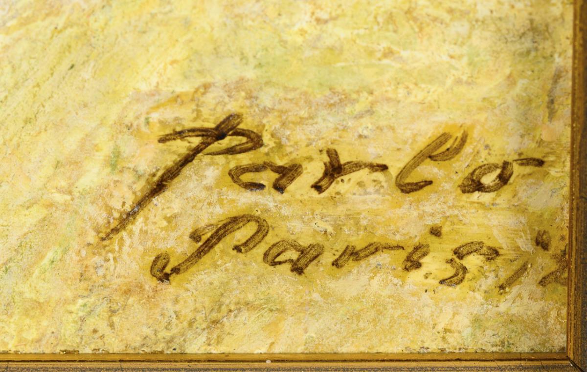 Oil/painted cardboard. Signed lower right with addition Paris.