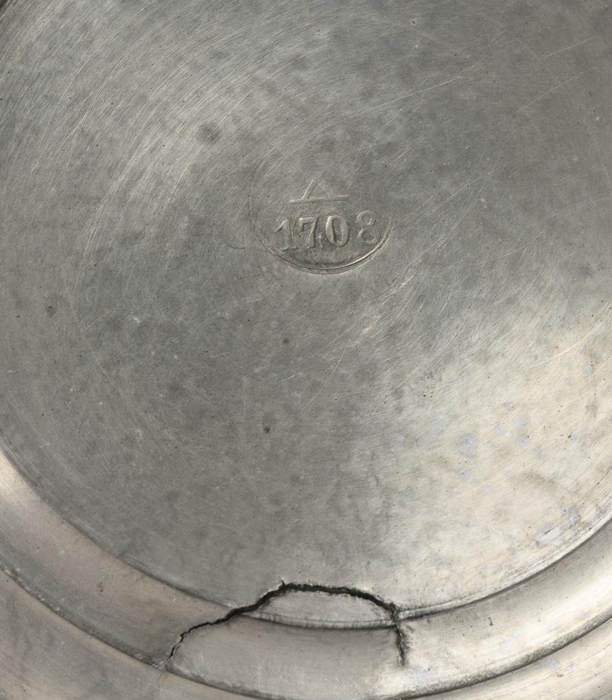 Small wedding jug with exceedingly richly engraved surface: couple in heart with motto, on the lid "J. Schreiber a: Neschwitz 1936." / Larger jug with finely engraved Fall of Man and motto, on the lid "A. Stein 1806". Large jug lid crack on the pusher and more dented, each some signs of age / use.