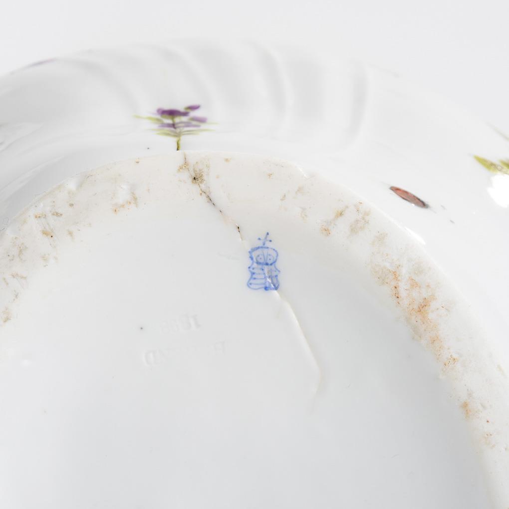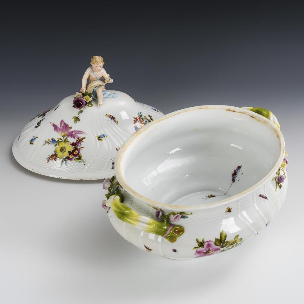 Form "Neuozier". Oval tureen with branch handles, floral decoration and figure of a putto with cornucopia on the lid. With floral and insect painting. Fire crack on the stand, flowers partially and left hand of the putto bumped, small, partly production-related bumps on the edge of the lid.