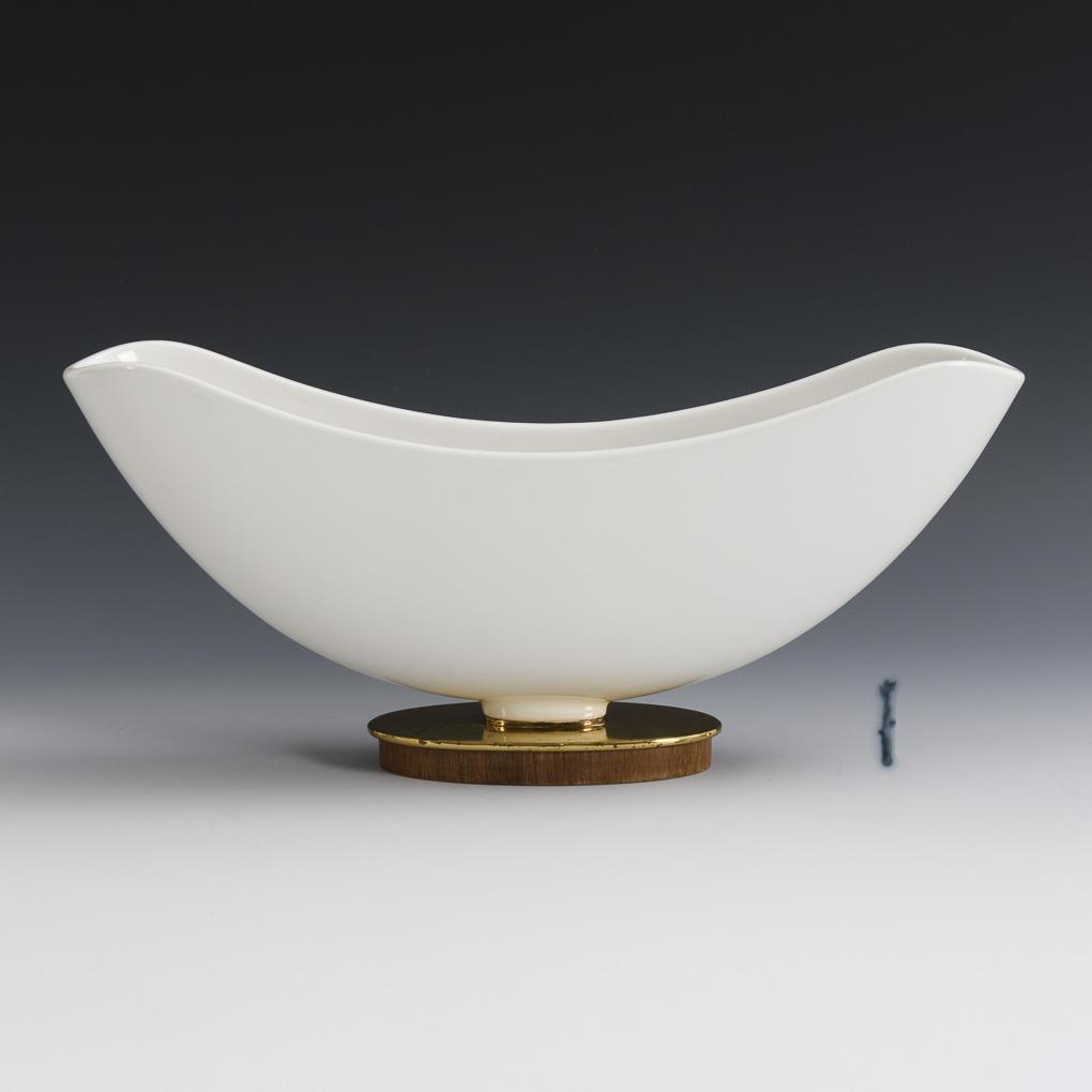 Flower ship with plug insert, on oval brass plinth, on wooden base.