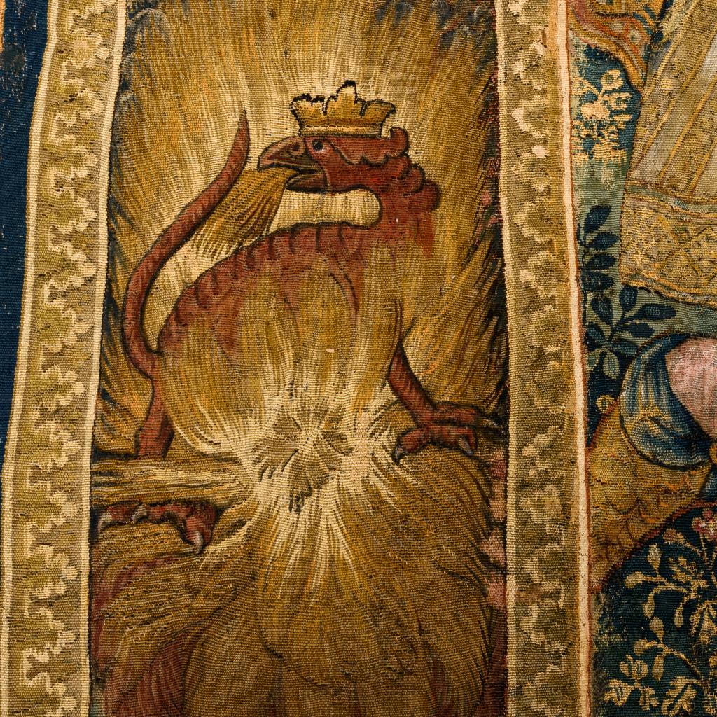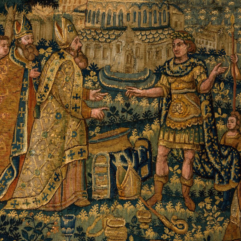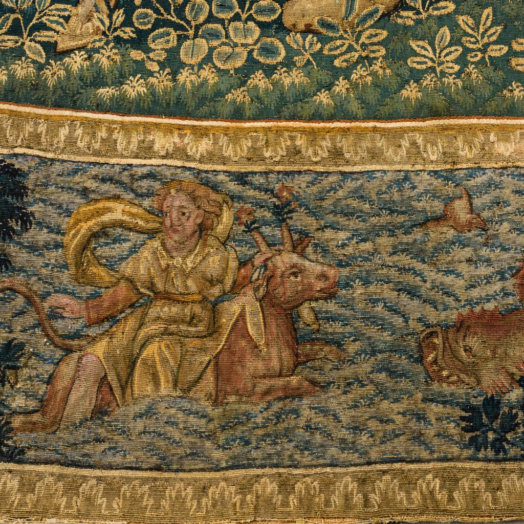 Eindrucksvoll präsentieren sich hier Figurenszenen einer historischen Erzählung im Hauptfeld des Bildteppichs und Gestalten der griechischen Mythologie in einer vielfigurigen Bordüre mit Verweisen auf Vergänglichkeit, Auferstehung und Ewigkeit. Im Zentrum befindet sich die Darstellung eines mit Lorbeer bekrönten Herrschers (Kaiser Konstantin?), der auf einem Thron sitzend - umgeben von Soldaten und einem Berater - eine Briefbotschaft empfängt oder übergibt. Parallel zur Briefübergabe ist im linken oberen Bildbereich, zeitlich und örtlich versetzt, eine Szene zu sehen, die vor dem Hintergrund einer imposanten Tempelarchitektur 2 Bischöfe im Gespräch mit dem Herrscher zeigt, der gleichermaßen auf die Geistlichen und auf seine Soldaten verweist. Zwischen ihnen zu Füßen befinden sich die bischöflichen Insignien. Die äußerst detailreich gestaltete Bordüre umfasst u.a. Szenen der griechischen Mythologie, die als Analogien oder Begleitthemen zu den Schilderungen im zentralen Bildteil, aber auch als Darstellungen der 4 Elemente gelesen werden können. Im oberen Bereich sind Hera mit dem Pfau und Göttervater Zeus(?) zu sehen, die von Sonne und Mond als Elemente eines zyklischen Kosmos flankiert werden (Luft). Links werden mittels Feuer- und Tiersymbolik wie dem Drachen und dem Phönix Niedergang und Auferstehung versinnbildlicht (Feuer). Am rechten Rand wird der Harfe spielende Orpheus in einer Art Waldidylle mit zahlreichen Tieren gezeigt (Erde). Im unteren Bordürenrand ist der Raub der Europa, die von dem Stier über das Meer getragen wird, dargestellt (Wasser). Alters- und Gebrauchsspuren, partiell Defekte und Reparaturen.