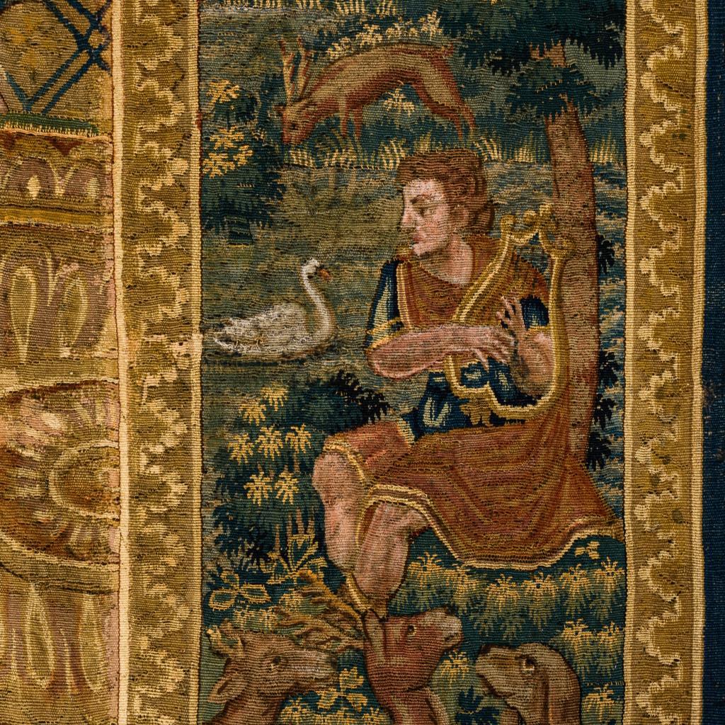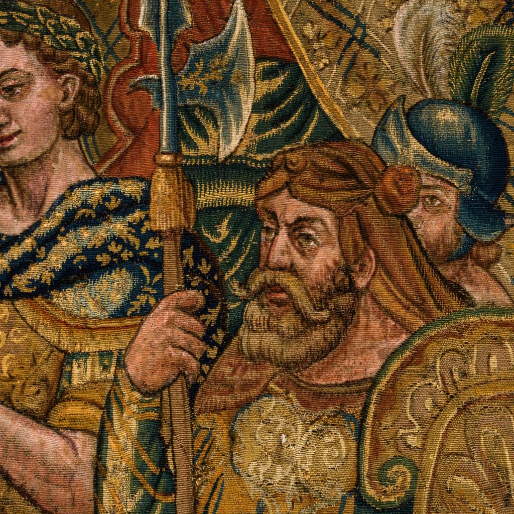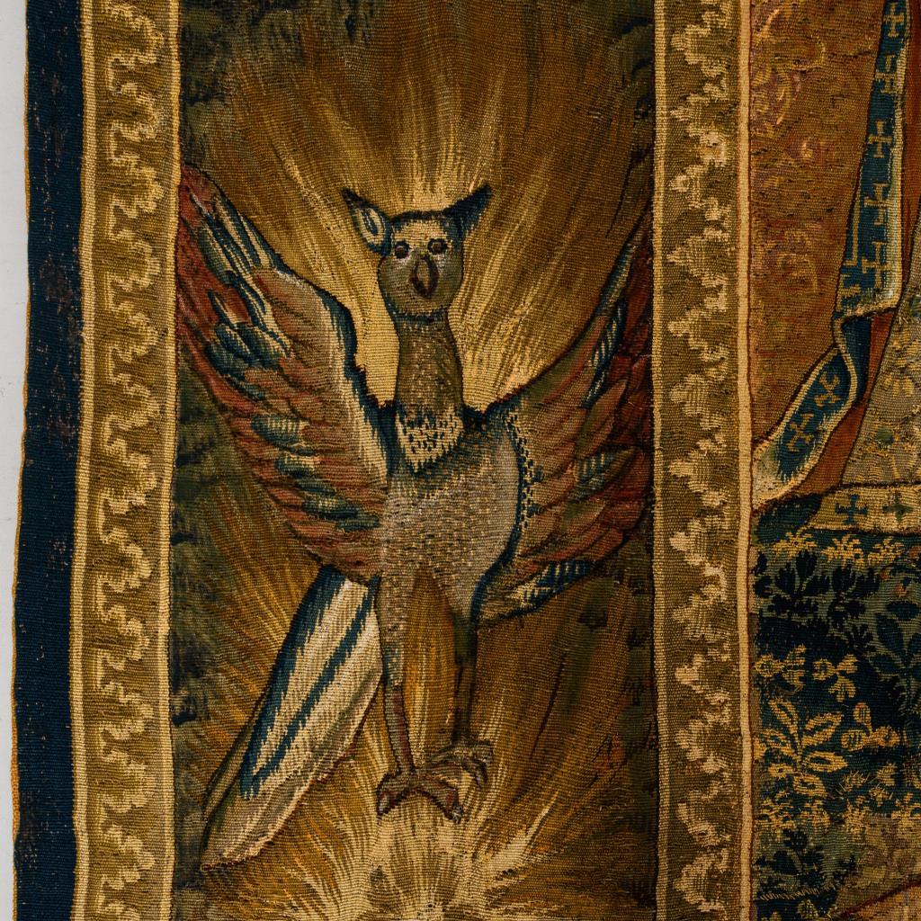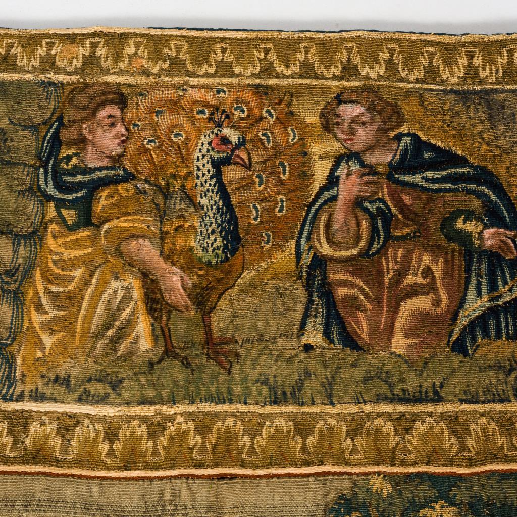 Eindrucksvoll präsentieren sich hier Figurenszenen einer historischen Erzählung im Hauptfeld des Bildteppichs und Gestalten der griechischen Mythologie in einer vielfigurigen Bordüre mit Verweisen auf Vergänglichkeit, Auferstehung und Ewigkeit. Im Zentrum befindet sich die Darstellung eines mit Lorbeer bekrönten Herrschers (Kaiser Konstantin?), der auf einem Thron sitzend - umgeben von Soldaten und einem Berater - eine Briefbotschaft empfängt oder übergibt. Parallel zur Briefübergabe ist im linken oberen Bildbereich, zeitlich und örtlich versetzt, eine Szene zu sehen, die vor dem Hintergrund einer imposanten Tempelarchitektur 2 Bischöfe im Gespräch mit dem Herrscher zeigt, der gleichermaßen auf die Geistlichen und auf seine Soldaten verweist. Zwischen ihnen zu Füßen befinden sich die bischöflichen Insignien. Die äußerst detailreich gestaltete Bordüre umfasst u.a. Szenen der griechischen Mythologie, die als Analogien oder Begleitthemen zu den Schilderungen im zentralen Bildteil, aber auch als Darstellungen der 4 Elemente gelesen werden können. Im oberen Bereich sind Hera mit dem Pfau und Göttervater Zeus(?) zu sehen, die von Sonne und Mond als Elemente eines zyklischen Kosmos flankiert werden (Luft). Links werden mittels Feuer- und Tiersymbolik wie dem Drachen und dem Phönix Niedergang und Auferstehung versinnbildlicht (Feuer). Am rechten Rand wird der Harfe spielende Orpheus in einer Art Waldidylle mit zahlreichen Tieren gezeigt (Erde). Im unteren Bordürenrand ist der Raub der Europa, die von dem Stier über das Meer getragen wird, dargestellt (Wasser). Alters- und Gebrauchsspuren, partiell Defekte und Reparaturen.