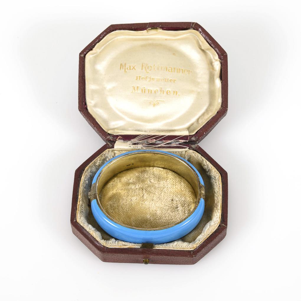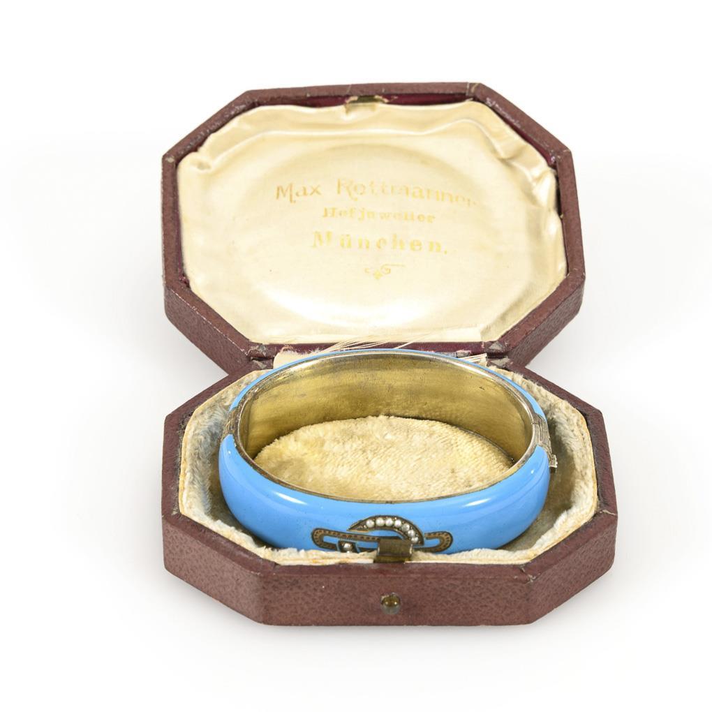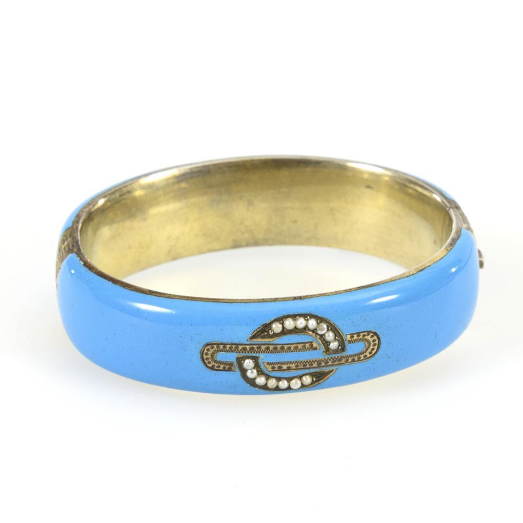 Oval enameled hinged hoop with pearl inset on the front between ornamental engraving. Box lock with security chain.
