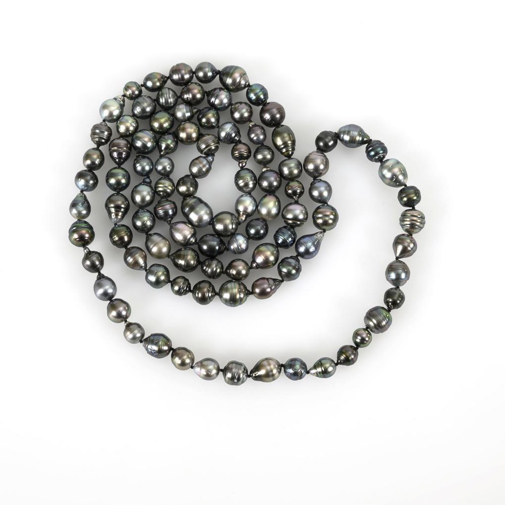 Continuous lace-up chain with various partially grooved baroque beads in single knot.