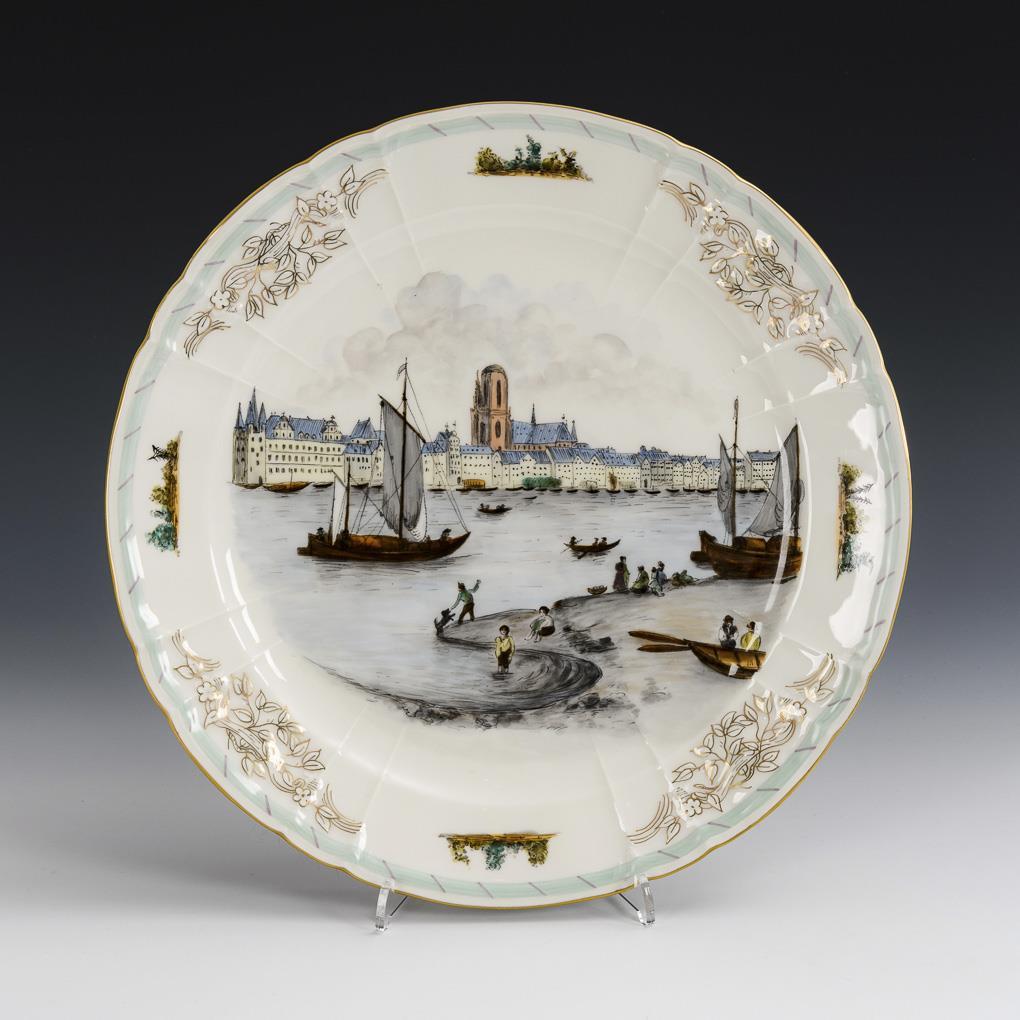 Model "Antikzierat". Large plate with the mirror painted view of Frankfurt am Main with sailing boats and figural staffage.