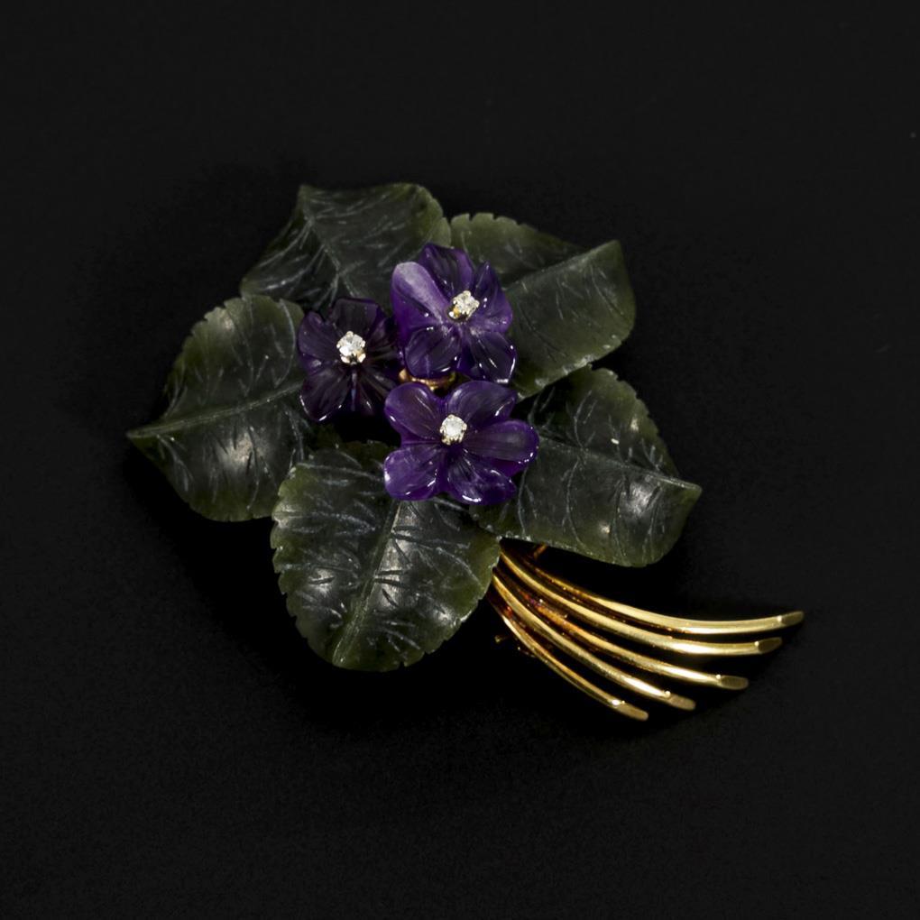Violet brooch with amethysts, nephrite jade and diamonds.