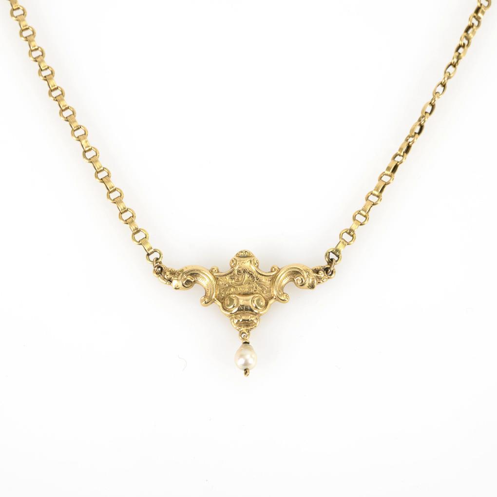 Tested yellow gold 585. Indistinctly hallmarked. Show piece 4.2 x 3 cm. L 40,5 cm. 11,4 g.