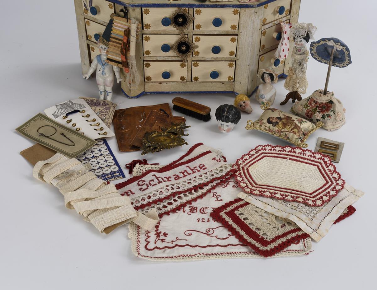 Shop cabinet with 18 drawers and 2 small mirrors. Set up as a fabric and sewing store with bales of fabric, buttons, pincushions, etc. In addition, some porcelain heads and figures with defects and other accessories in separate box. Traces of age, small defects.