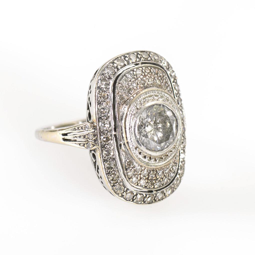 White gold 750 stamped. Ring size 54. diamond approx. 1.05 ct/W/PII. Diamonds total approx. 0.50 ct. 6.2 g.
