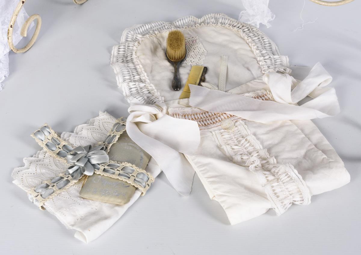 Curved iron frame with canopy and extensive textile equipment. In addition, some parts accessories. Traces of age, small paint defects.