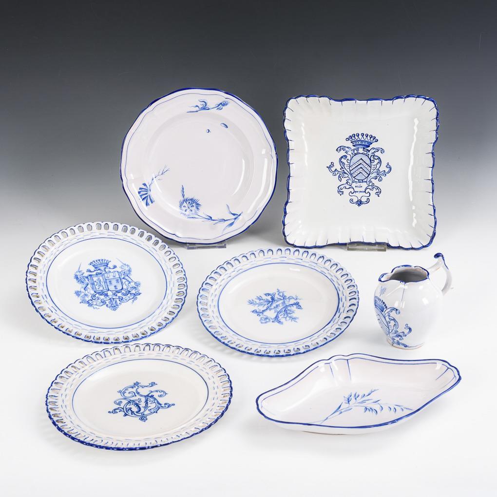 1 square bowl (23 x 23 cm), 1 dinner plate (Ø 24 cm), 3 plates with openwork rim (Ø 21,5 cm), 1 diamond-shaped bowl (L 24,5 cm), 1 small jug (H 11,5 cm). Various shapes and decorations with coats of arms, monograms and plants. Square bowl restored, 2 small plates with hairline crack.