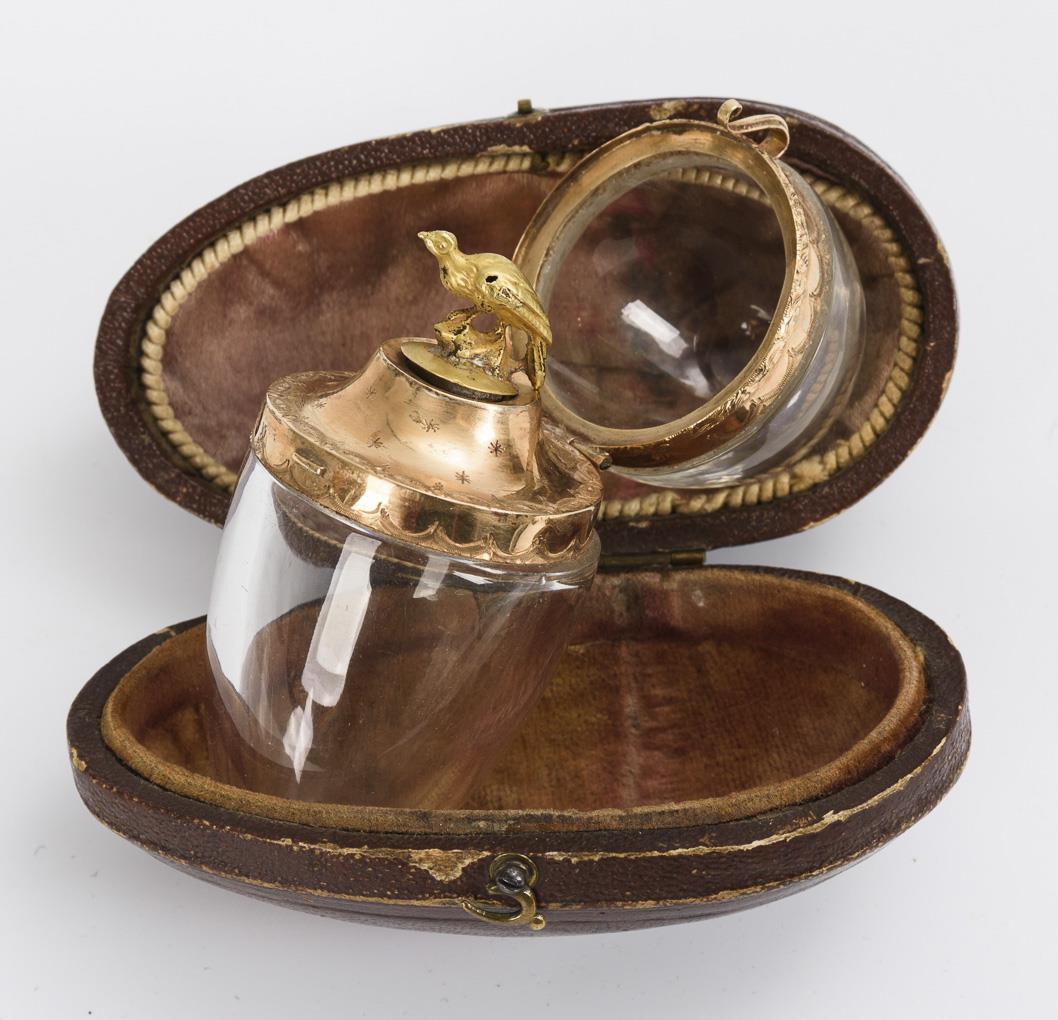 Ovoid glass flacon with hinged lid and finely engraved mounting; inner stopper with bird figure. Bird with wall hole, case some signs of age/use.