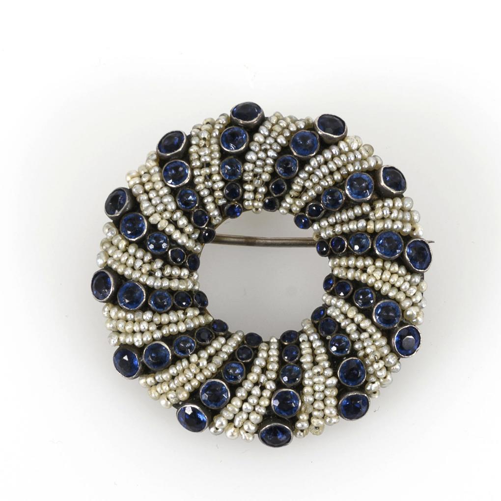Ring brooch with casket-set imitation blue and mounted seed pearls. Back floral engraved. Hook closure.
