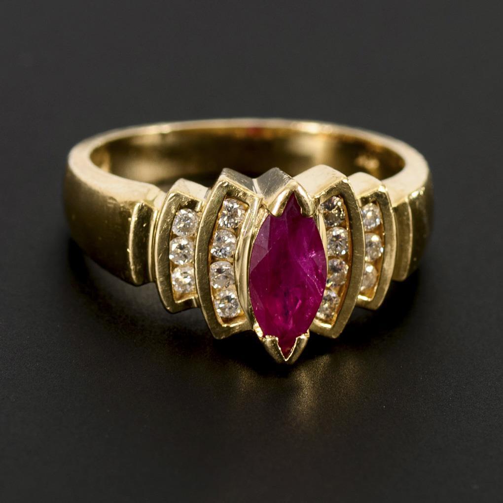 Ruby navette and 14 diamonds, between middle rail.