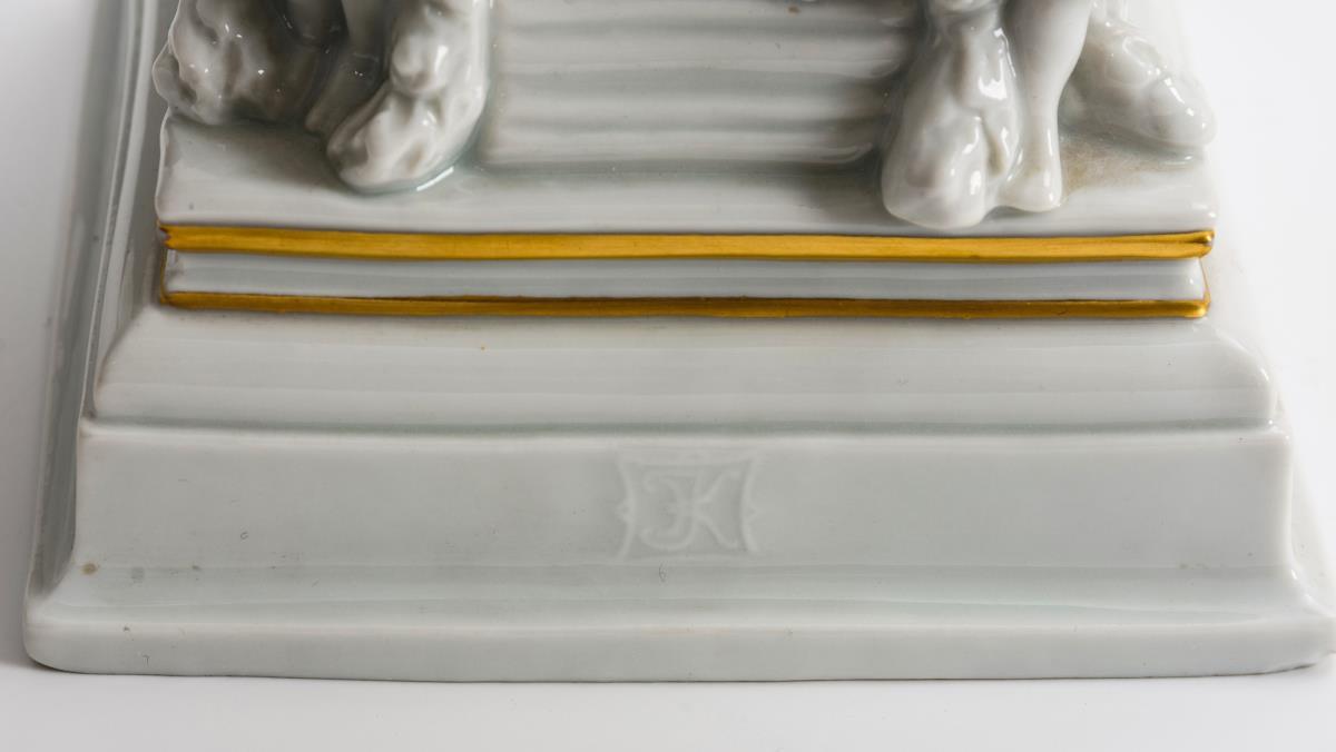 1 Sockelecke bestoßen, 1 kleine Bestoßung an der Bluse, partiell minimaler Goldabrieb.