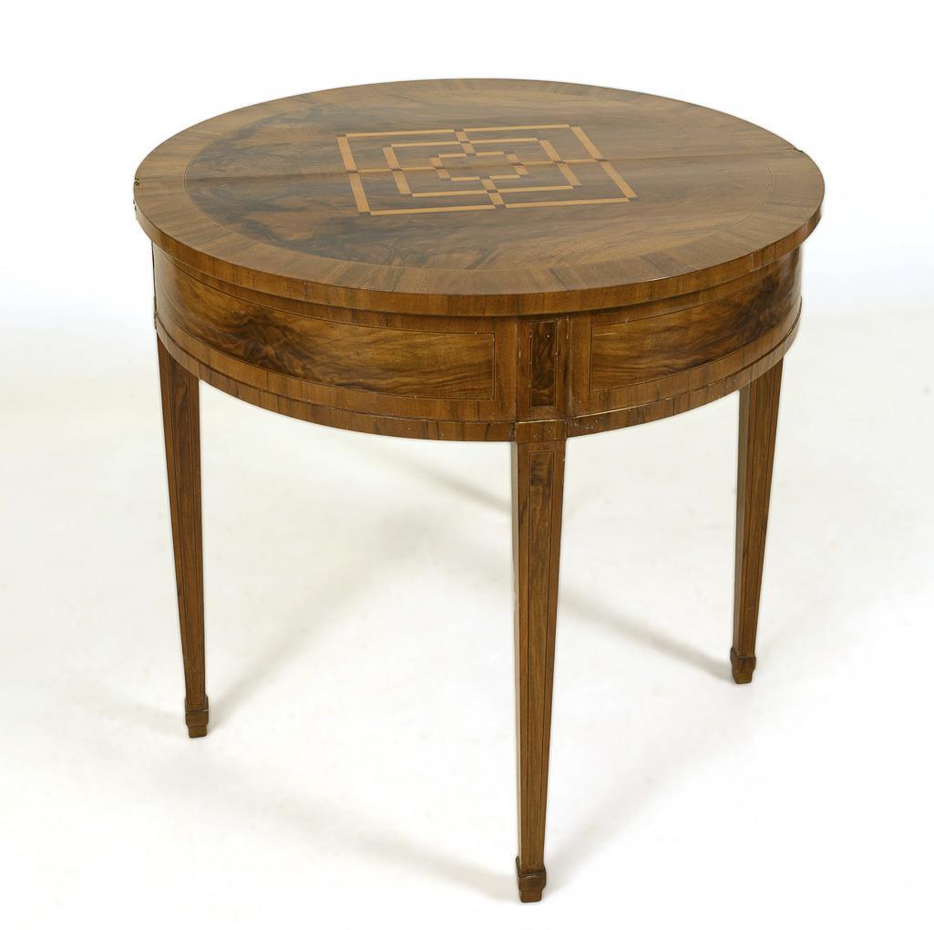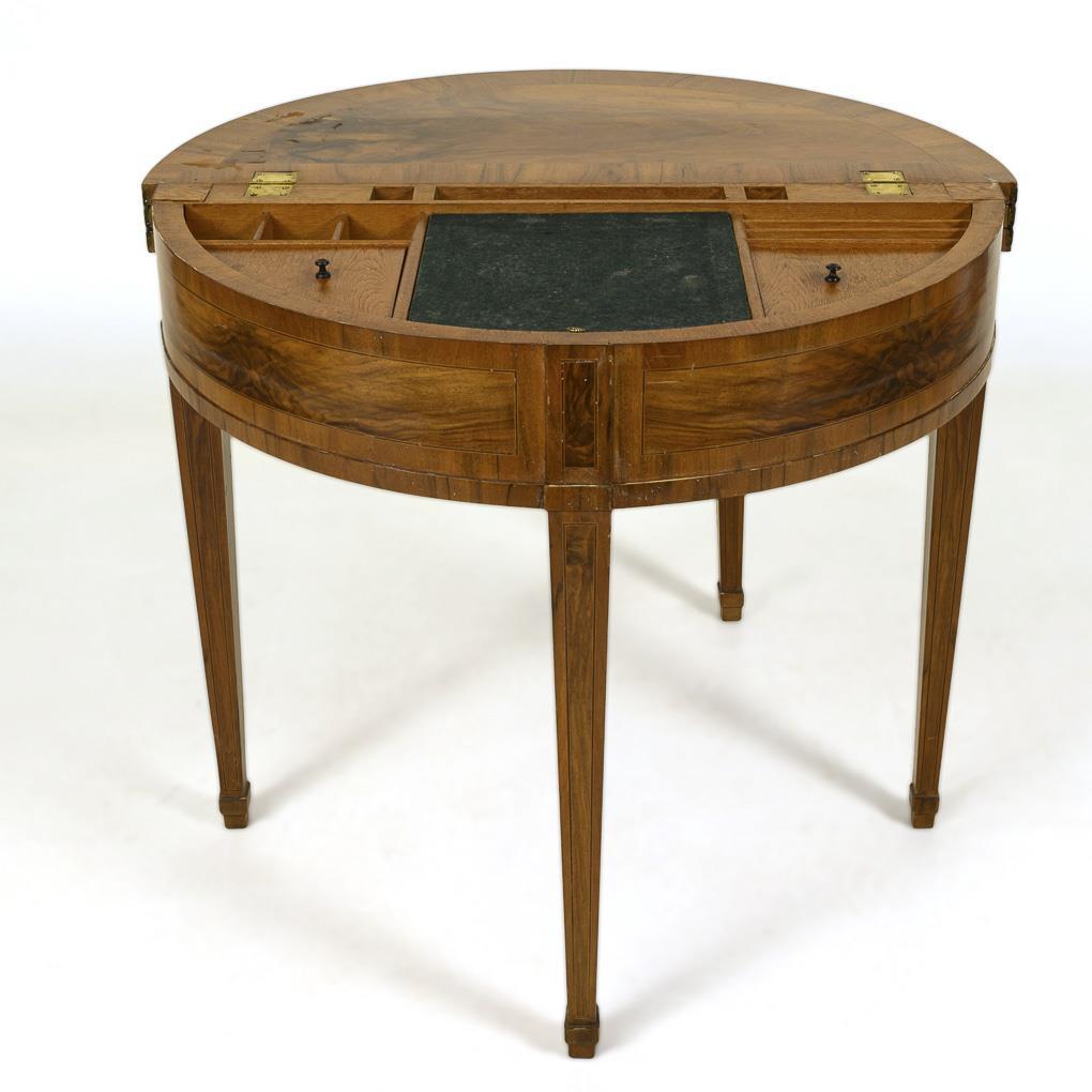 Rare transformation table "No.5": Description from the goods catalog of 1789 "[...] In a household is indisputably the most multiple use, the most accurate saving of space, the greatest perfection. [...] is the table folded and closed in a half circle, as it stands in a room on three feet. If you pull out the fourth foot and open the upper leaf, you have a completely round table with a queen and chess board. If you open the second leaf, you have a card table. If you finally open the third sheet, you have a desk covered with green cloth with a dinto barrel and a sandbox. If you lift a blanket attached here, so this partition of the table becomes a toilet.". Alt restored with additions, veneer scratched and dry cracked.