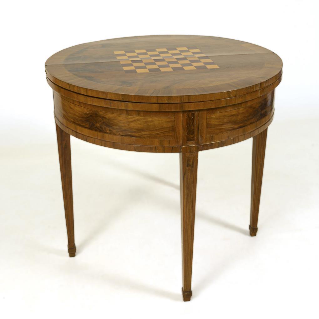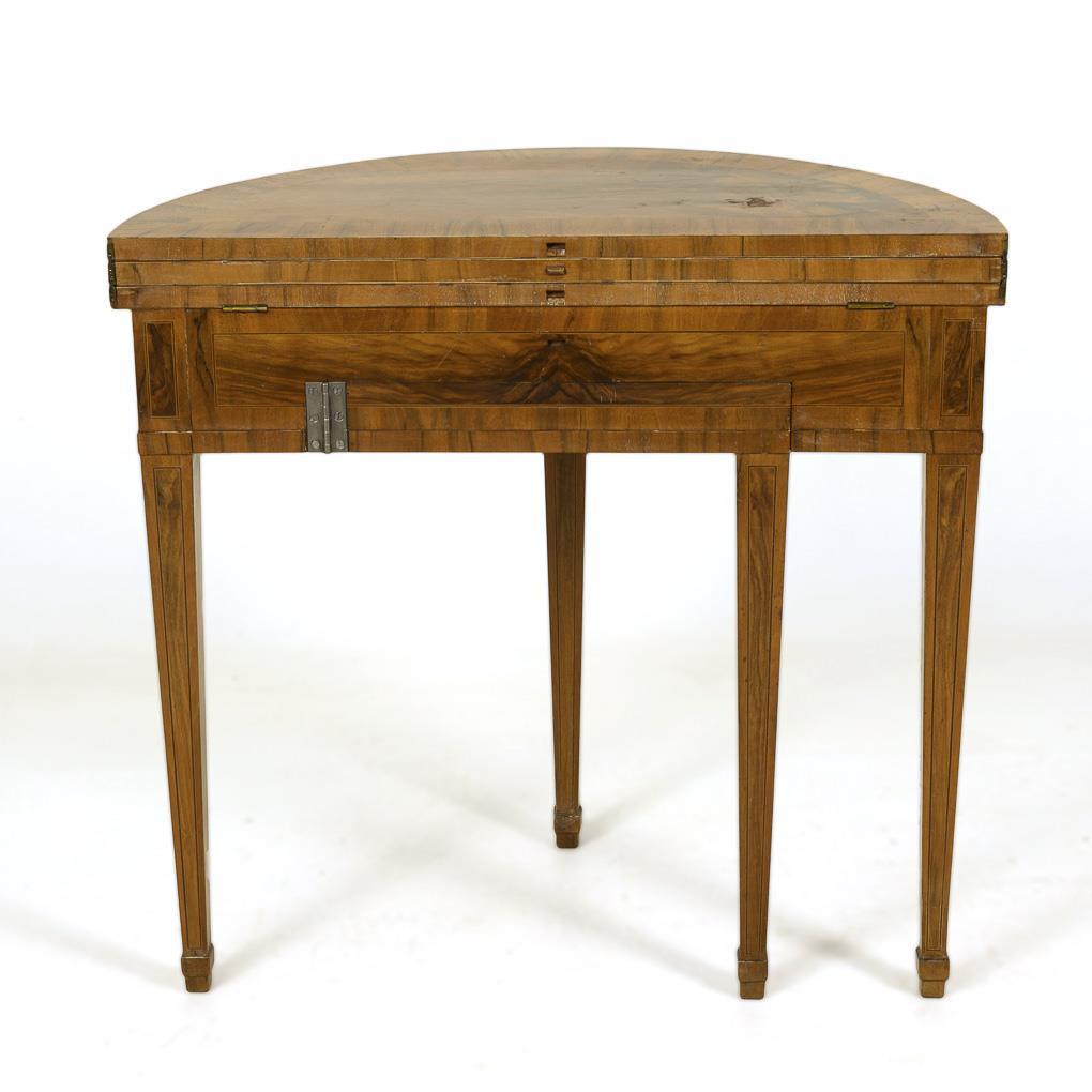 Rare transformation table "No.5": Description from the goods catalog of 1789 "[...] In a household is indisputably the most multiple use, the most accurate saving of space, the greatest perfection. [...] is the table folded and closed in a half circle, as it stands in a room on three feet. If you pull out the fourth foot and open the upper leaf, you have a completely round table with a queen and chess board. If you open the second leaf, you have a card table. If you finally open the third sheet, you have a desk covered with green cloth with a dinto barrel and a sandbox. If you lift a blanket attached here, so this partition of the table becomes a toilet.". Alt restored with additions, veneer scratched and dry cracked.