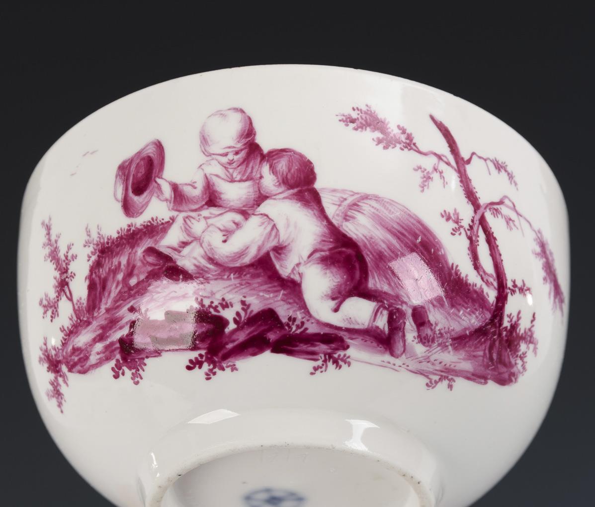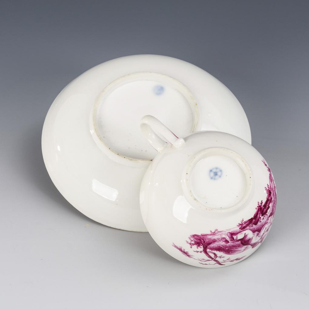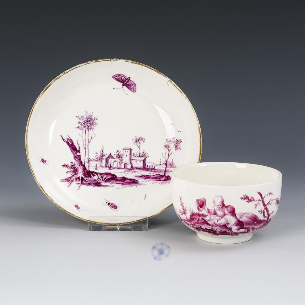 Bellied cup with ear handle. On the front the depiction of a landscape island with a pair of children, in the mirror of the saucer the depiction of a landscape with architecture. Hairline crack on the edge of the saucer, gold rubbed.