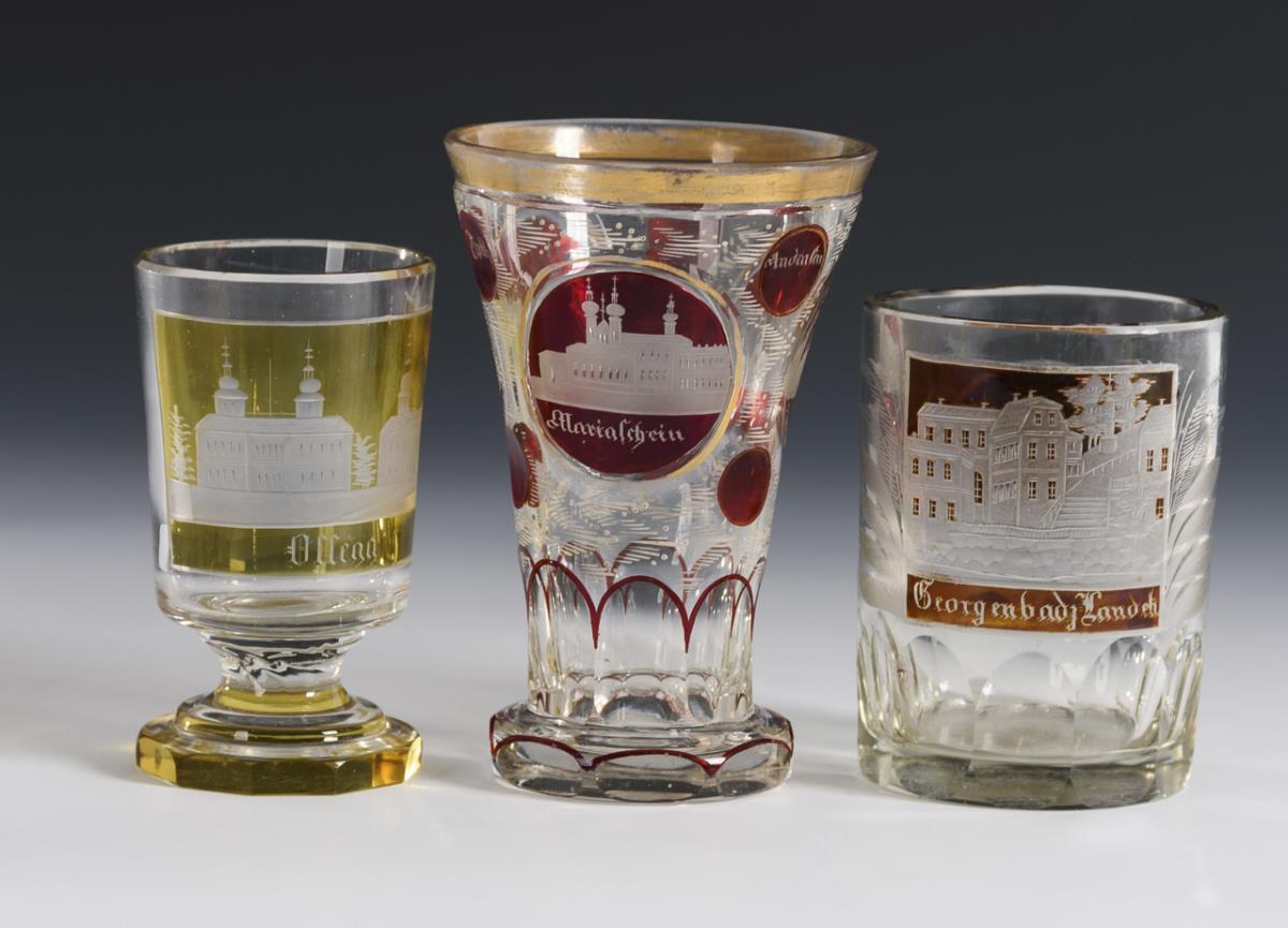 Various glasses with engraved views (Karlovy Vary, Ossegg, Georgenbad, Teplice and others). Partially with minimal bumps.