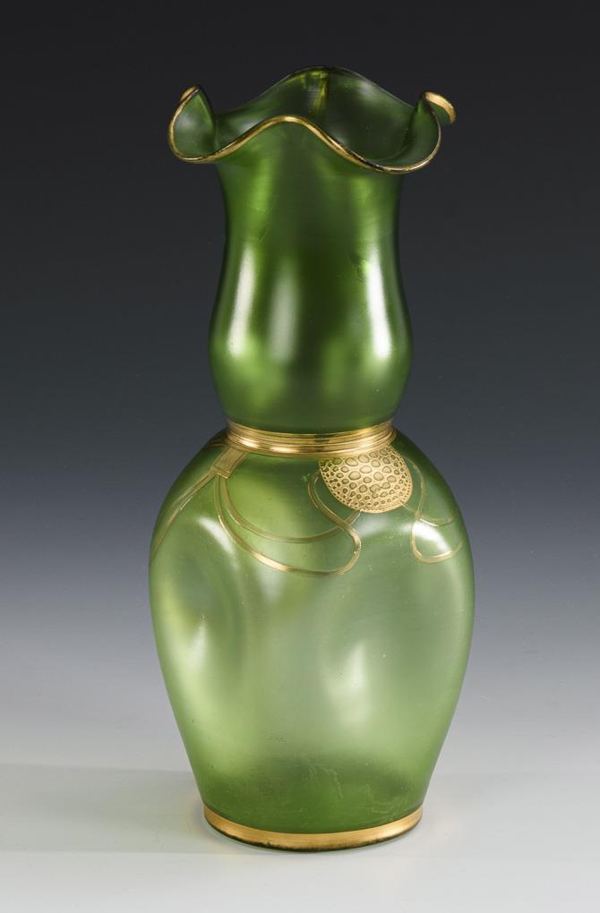 Green glass, gold staffage, iridescent. H 24,5 cm.