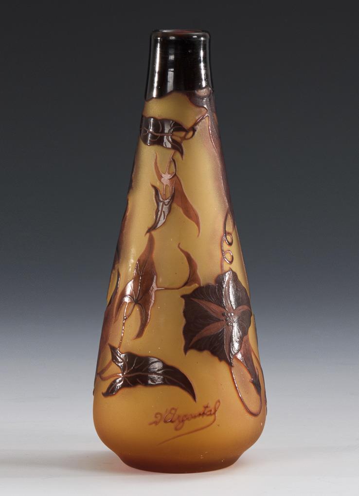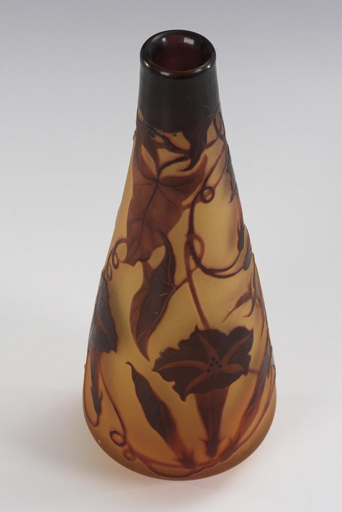 Tapered vase with a circumferential etched funnel coil decoration; dislocated break.