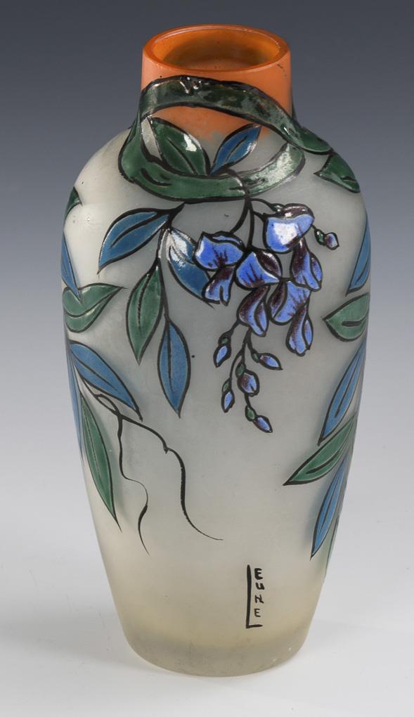 Art Nouveau vase with enamel painting. Leune.