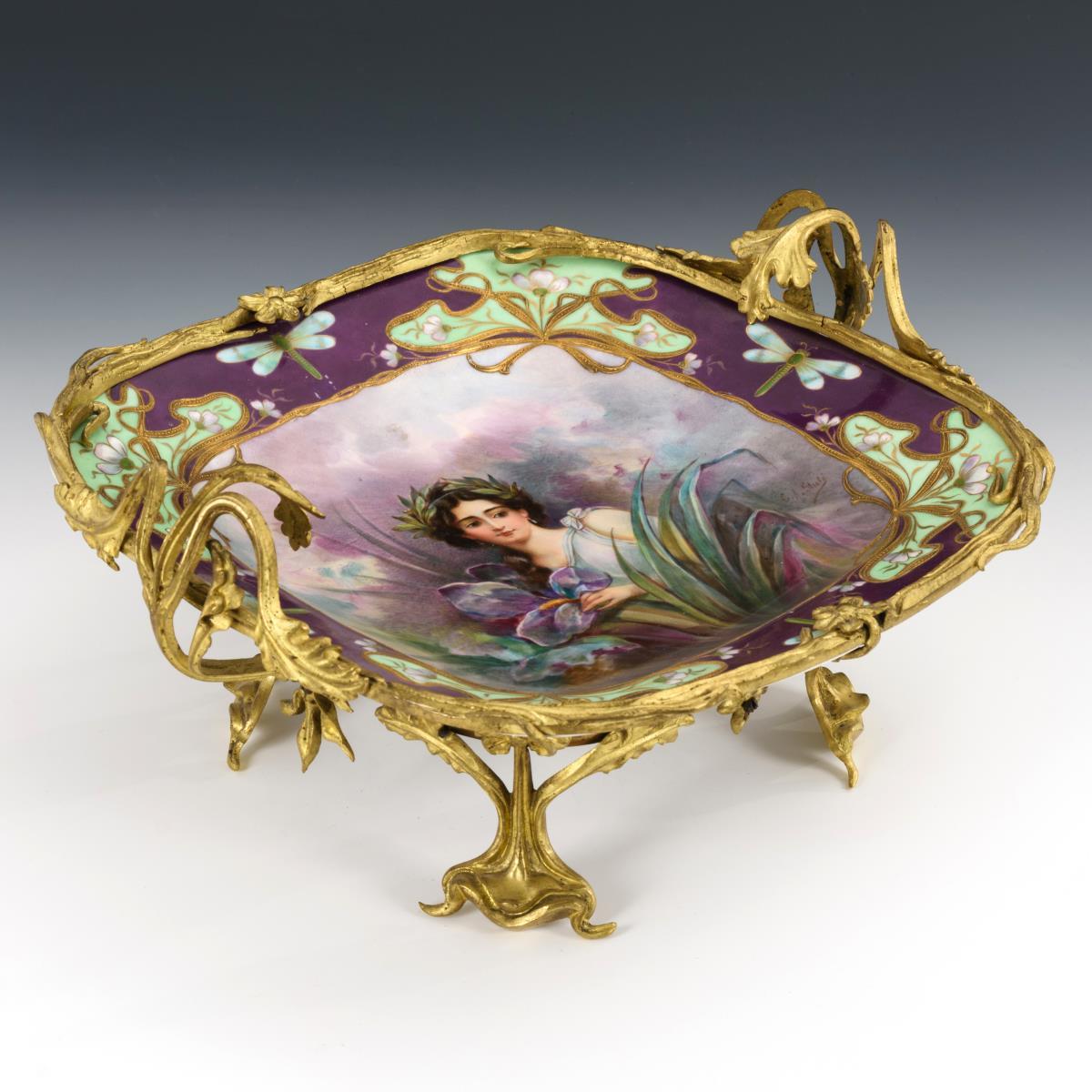 Rechteckige Schale mit violettem und grünem Teilfond auf der Fahne, im Spiegel die feine Malerei einer lorbeerbekränzten jungen Frau zwischen Schwertlilien. Florale Bronzemontierung mit zwei Handhaben und vier Füßen. Minimale Farbaplatzer auf der Fahne.