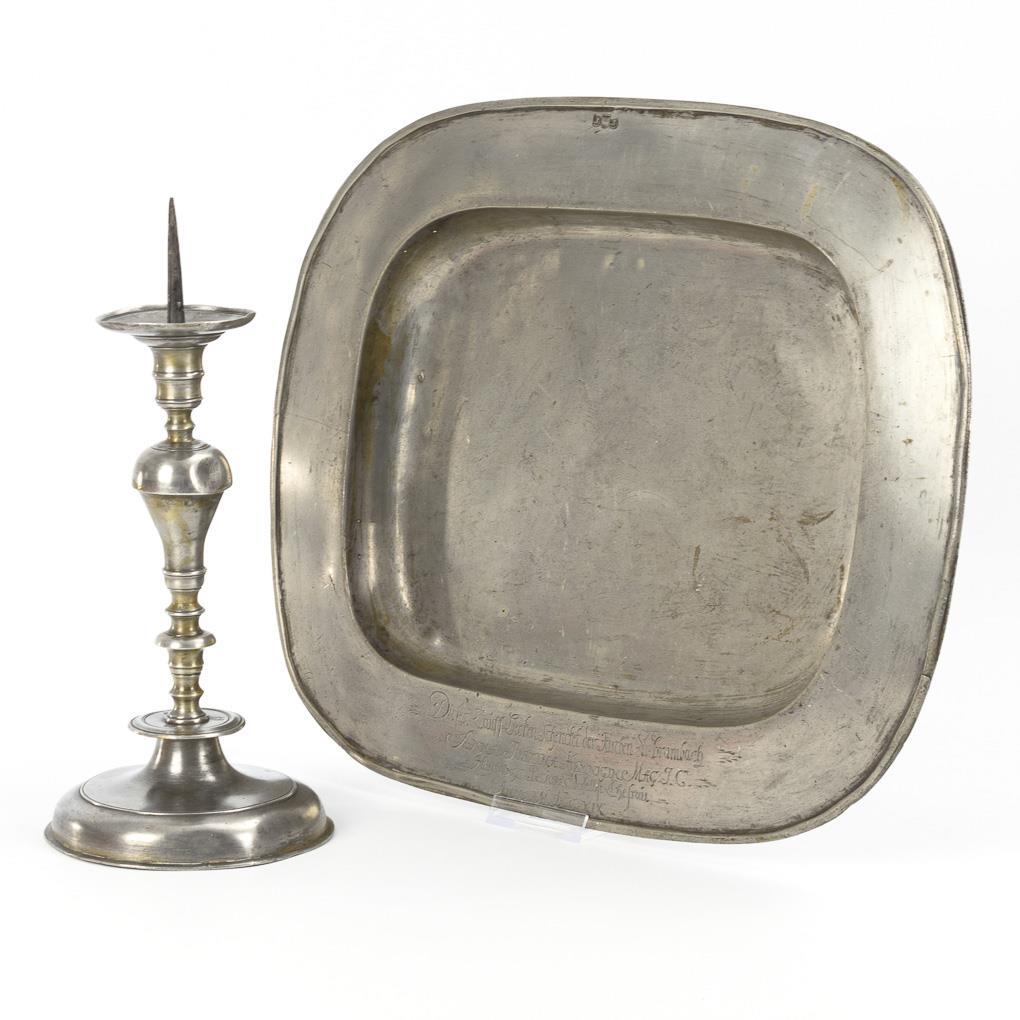 Rectangular baptismal bowl with rounded corners as well as engraved dedication on the flag: gift to the church at Brambach from Anna Justina, wife of the pastor "Mag. J. G. Hennig 1719." / Elaborately crafted candlestick, engraved in the foot: "Sabine Gablerin" with date 1763. Each some signs of age / use.