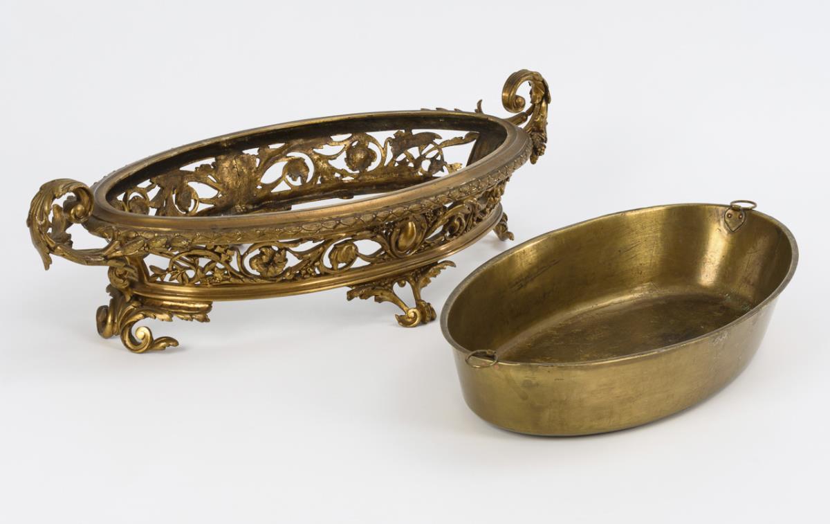 Overly richly designed, solid jardiniere with vegetal feet and handles and À-Jour vines with empty cartouches on the wall. Removable tin tray.