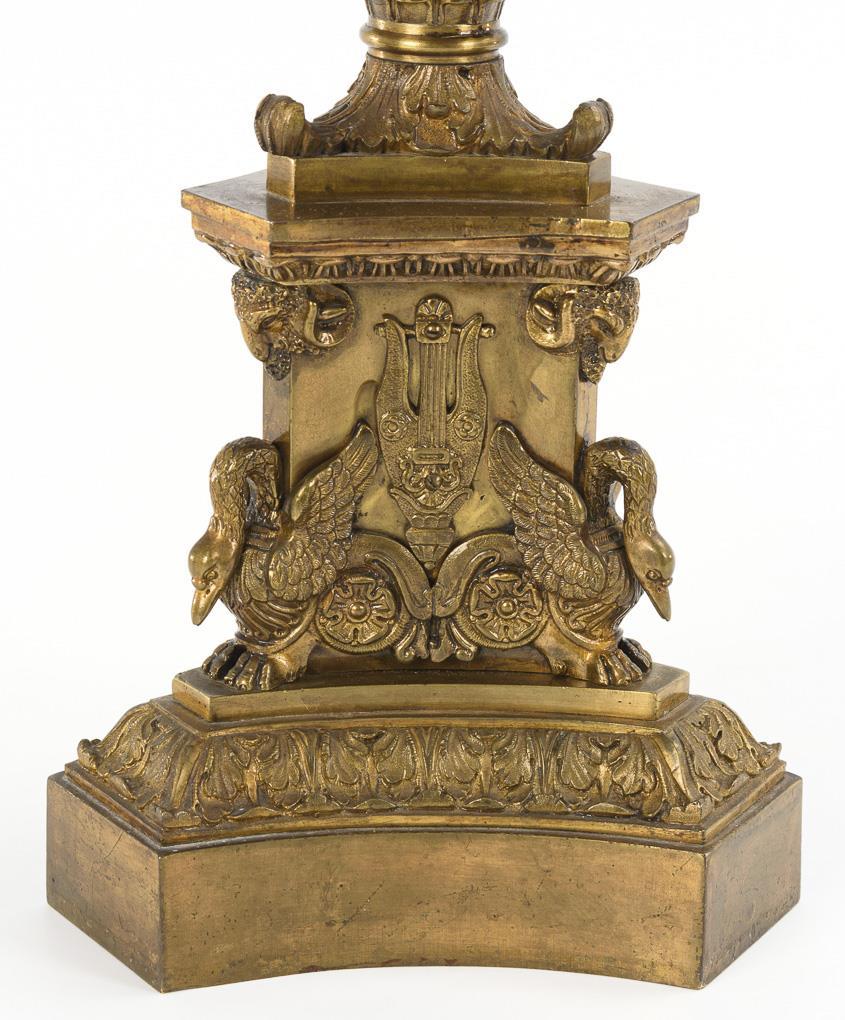 Magnificent relief candlesticks with swans, aigicrania and lyres on 3-sided base. Fluted column shaft with mascarons at the base, star-shaped arm attachment with raised central spout. Slipped arm attachment and some arms, 1 base cover plate incorrectly mounted (screw connection loose), 1 decorative disc under the wax plate missing, subsequently zaponiert.