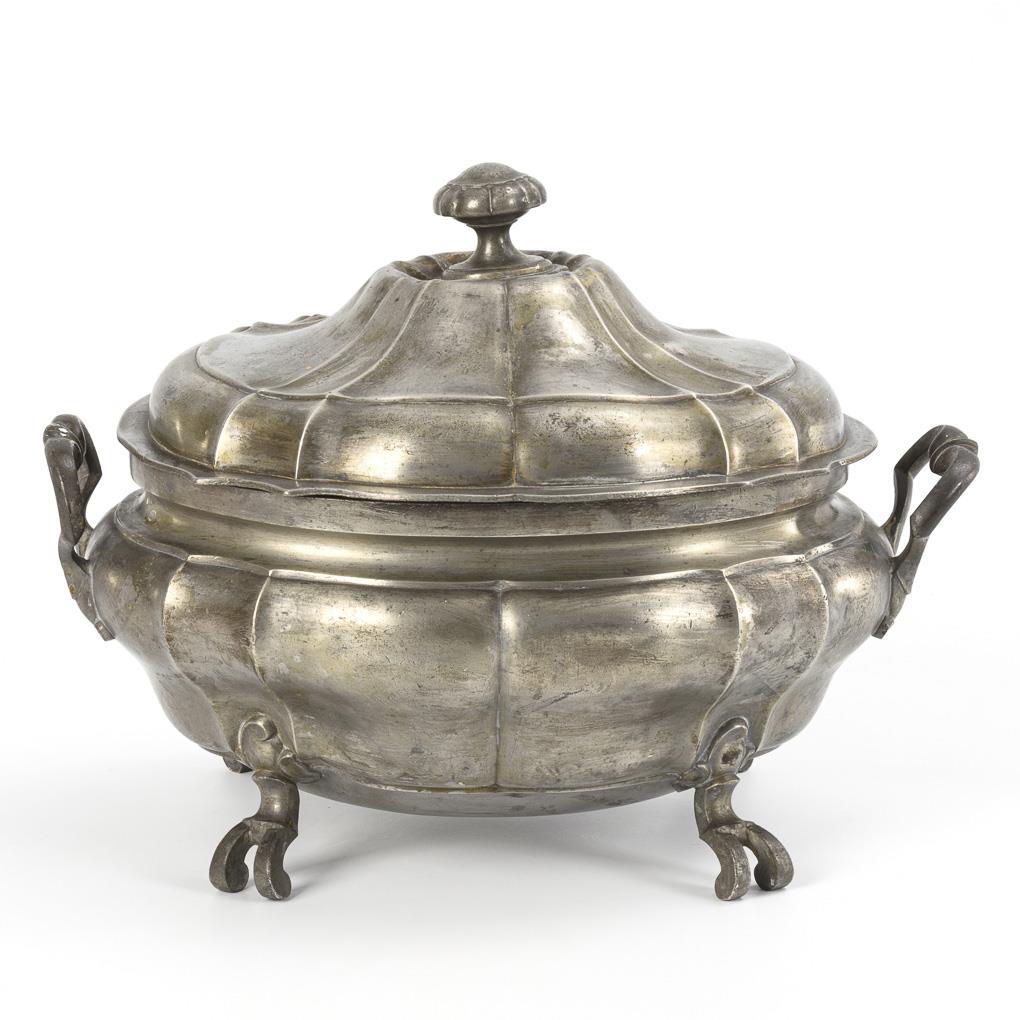 Tureen designed in baroque silver style with volute feet, rocaille handles, godroned wall as well as lid with knob. Partly heavier signs of age/use.